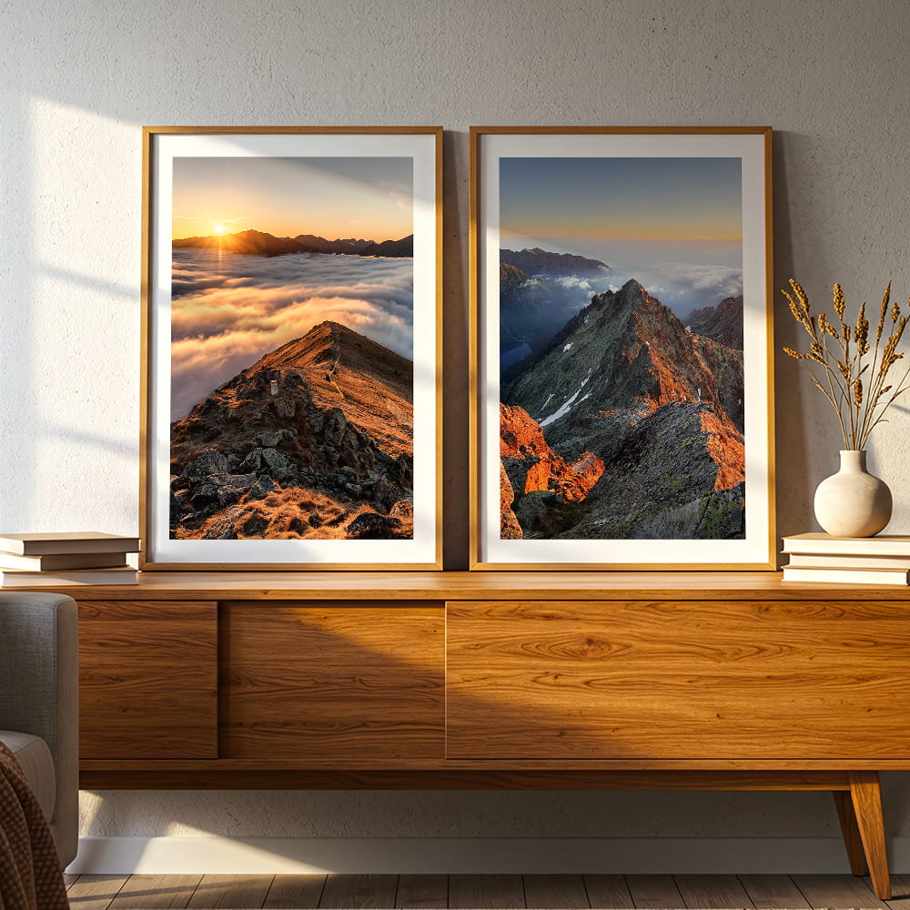 Galeria Plakatów Tatry - światło dnia przedstawia tatrzański krajobraz w spójnej kompozycji pełnej naturalnego światła i górskiej przestrzeni. Fotografie ukazują charakterystyczne szczyty, linie terenu oraz otwarte panoramy, które razem tworzą harmonijny zestaw inspirowany pięknem tatrzańskiej przyrody.