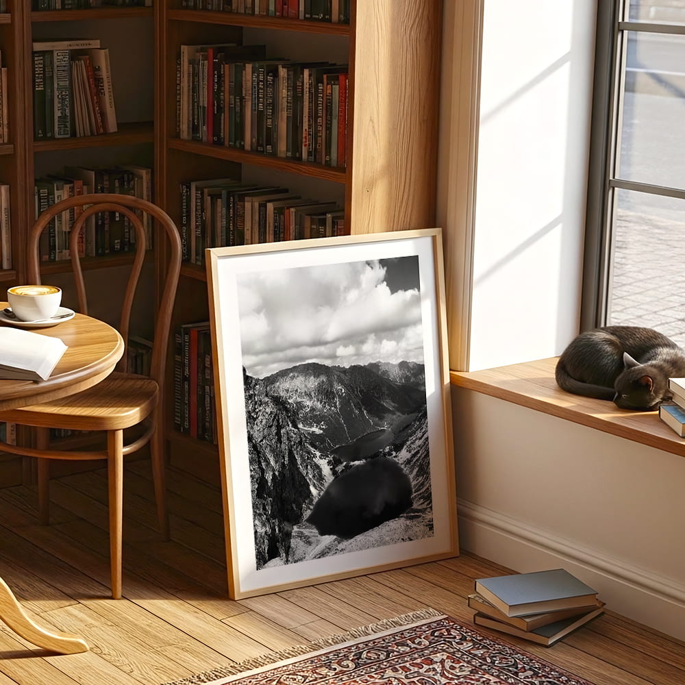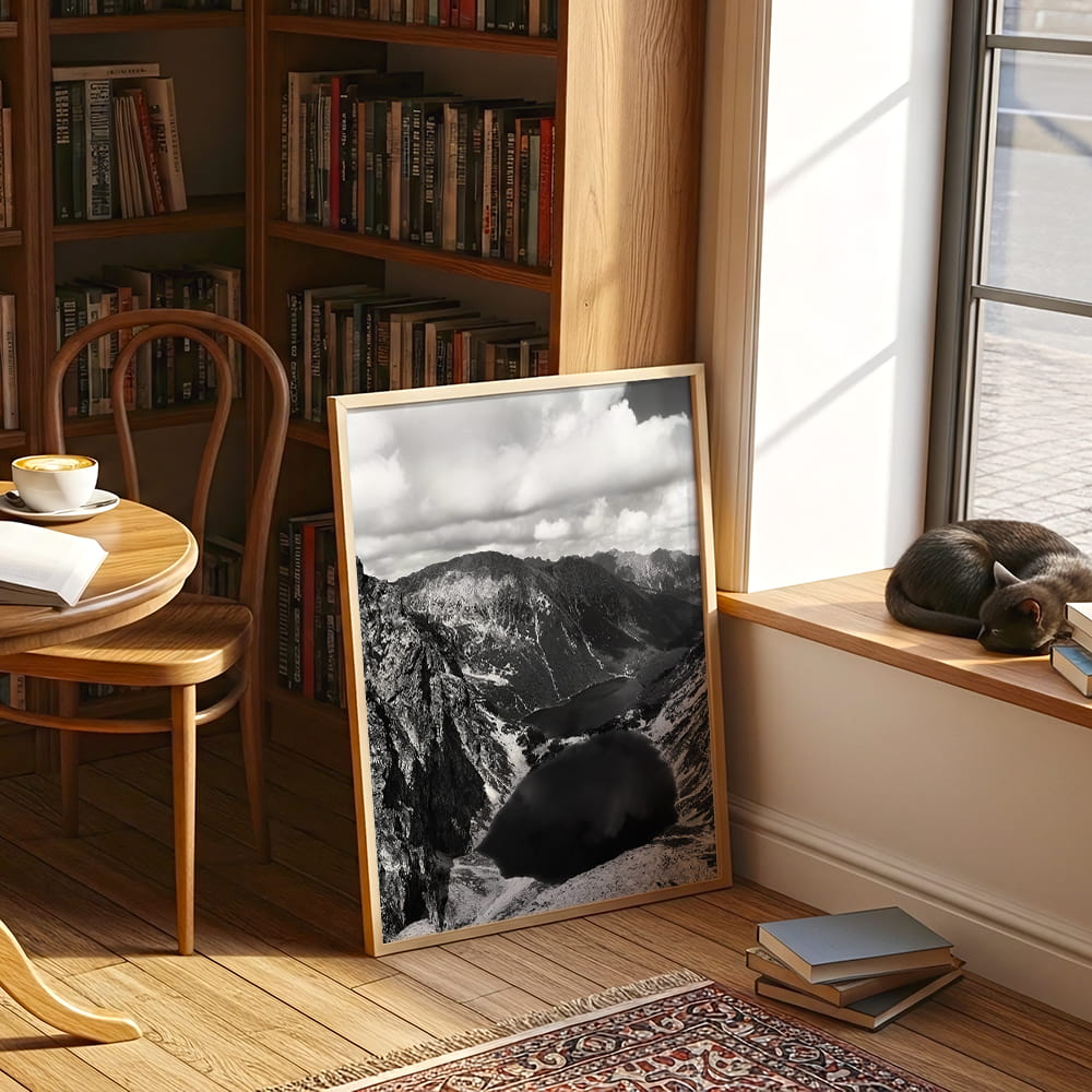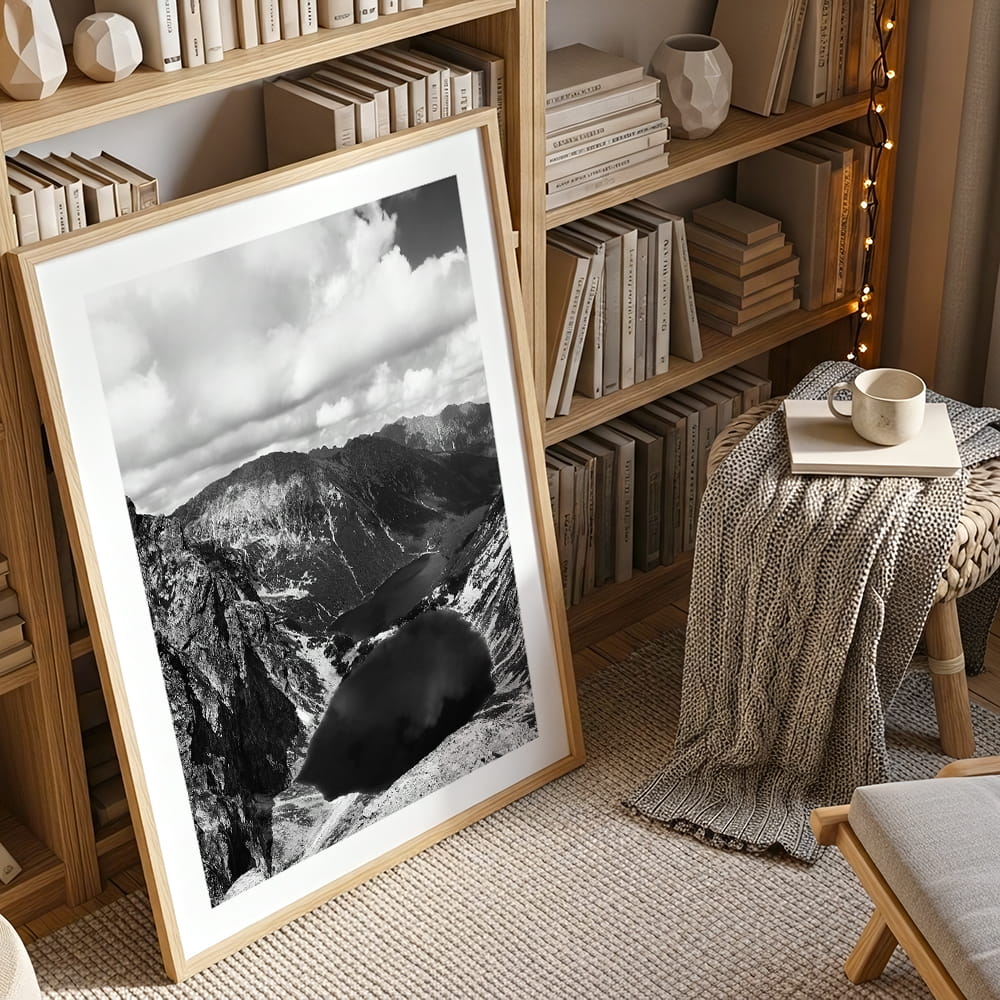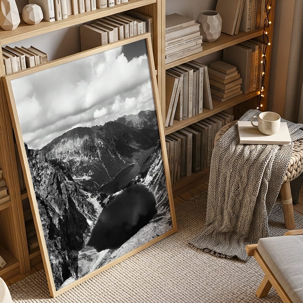 Czarno-biały plakat z Czarnym Stawem pod Rysami to kontemplacja surowego piękna Tatr. Odcienie szarości podkreślają dramatyczną rzeźbę krajobrazu, wydobywając z niego ciszę i majestat natury. Minimalistyczna forma dla wnętrz, które lubią oddychać spokojem.