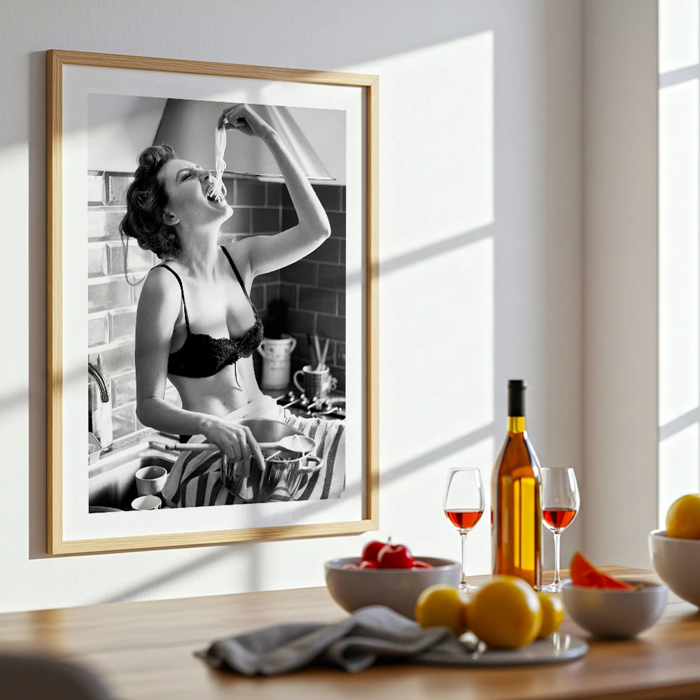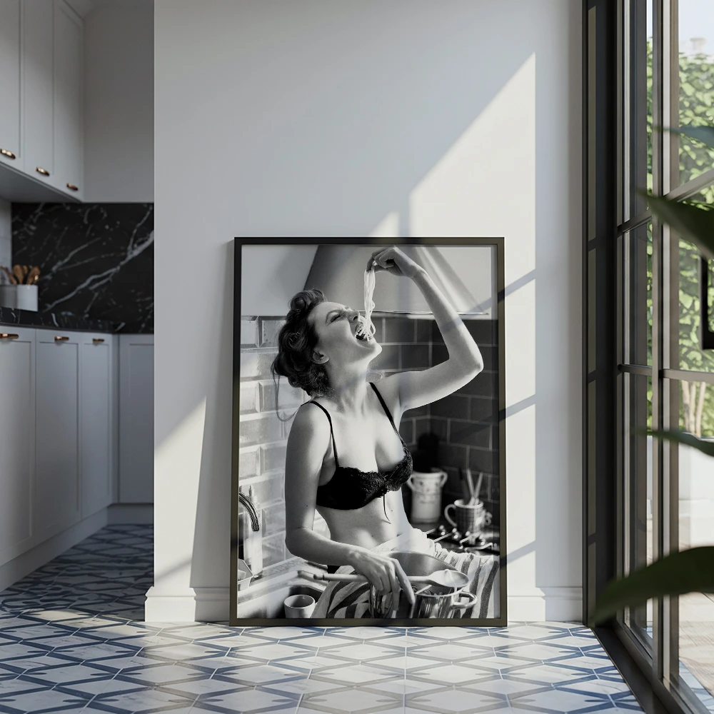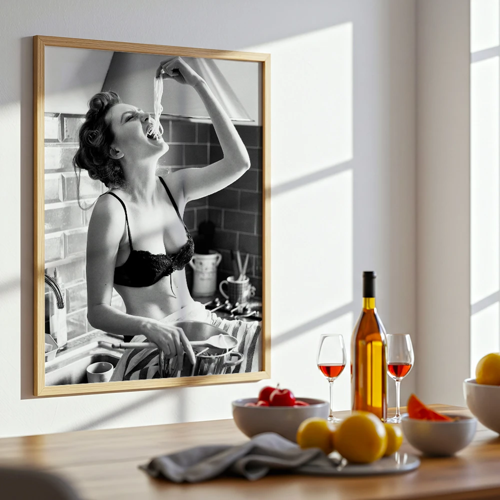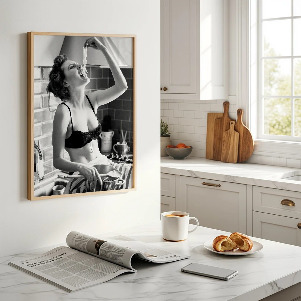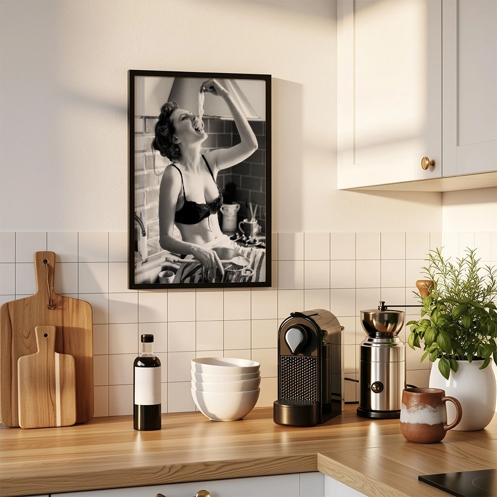 Plakat Dziewczyna w kuchni świetnie odnajdzie się w kuchni, jadalni, apartamencie lub wnętrzu inspirowanym stylem włoskim, nowoczesnym albo loftowym. To propozycja dla osób, które lubią dekoracje z charakterem, czarno-białe kadry i estetykę, w której codzienność łączy się z klimatem wielkiego miasta.