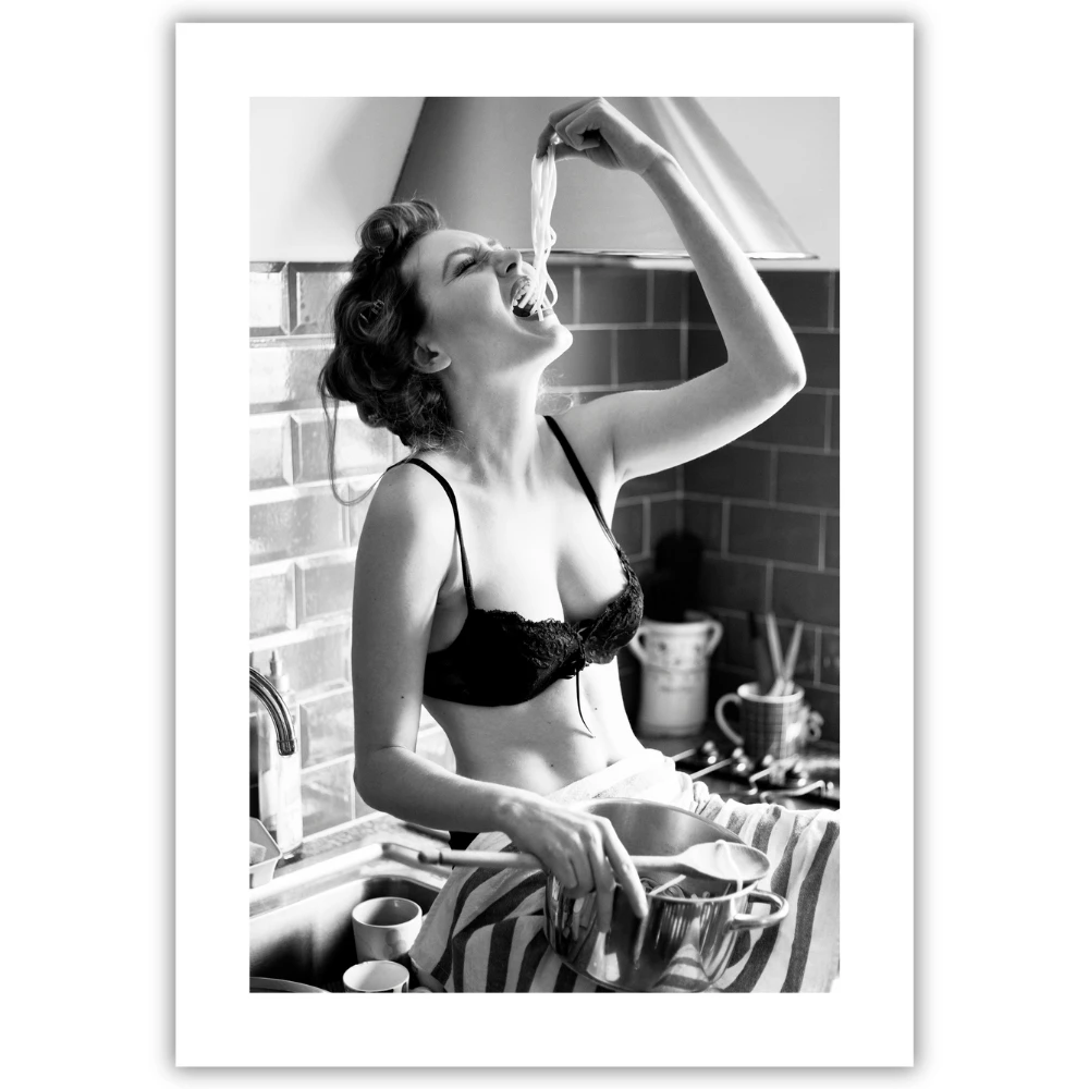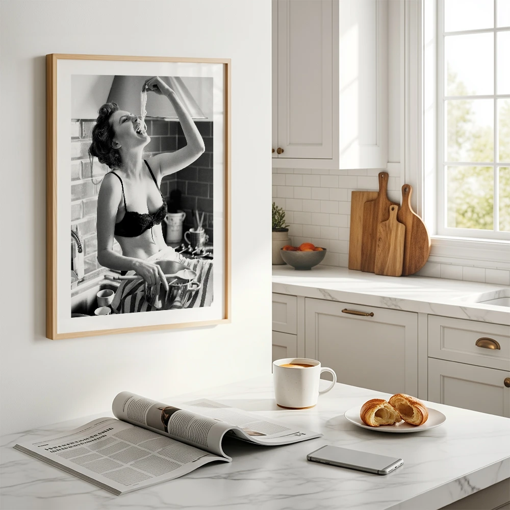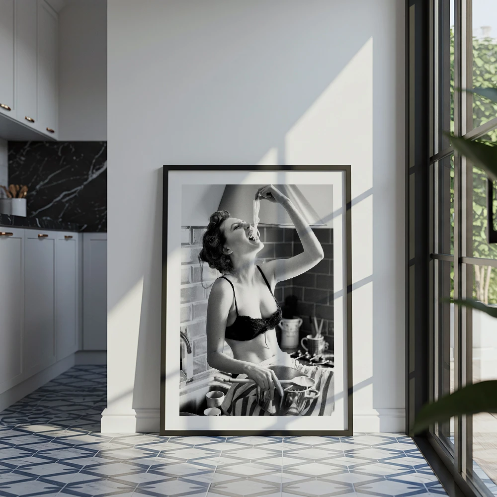 Plakat Dziewczyna w kuchni przedstawia nieoczywistą scenę, w której codzienność spotyka się z modową estetyką i fotograficzną lekkością. Czarno-białe ujęcie buduje wyrazisty nastrój, a dynamiczna kompozycja sprawia, że całość wygląda nowocześnie, odważnie i bardzo stylowo.