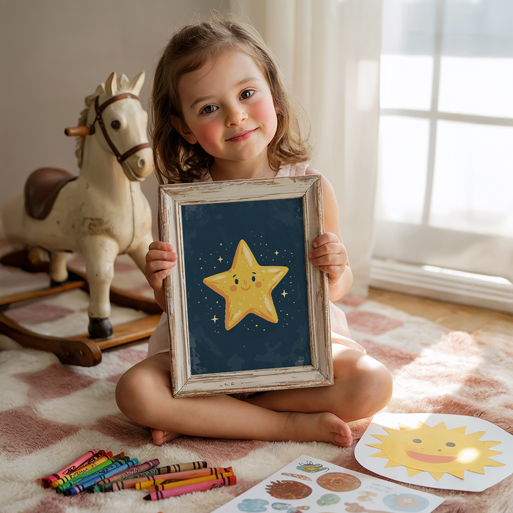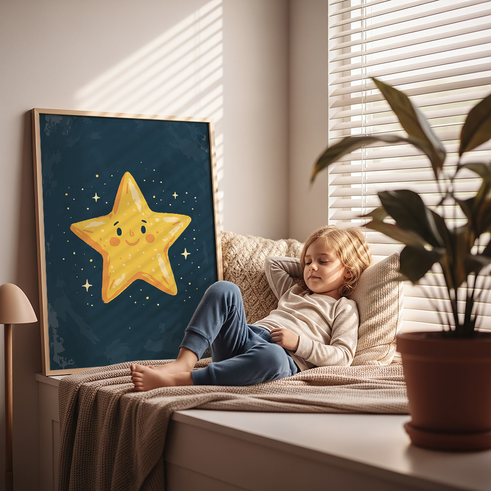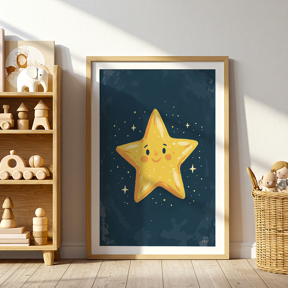 Plakat Gwiazda marzeń to dekoracja ścienna, która wnosi do wnętrza spokój, ciepło i subtelny, bajkowy nastrój. Urocza ilustracja uśmiechniętej gwiazdy przyciąga uwagę prostą, przyjazną formą i tworzy w pokoju dziecka atmosferę pełną łagodności, światła i dziecięcej radości.