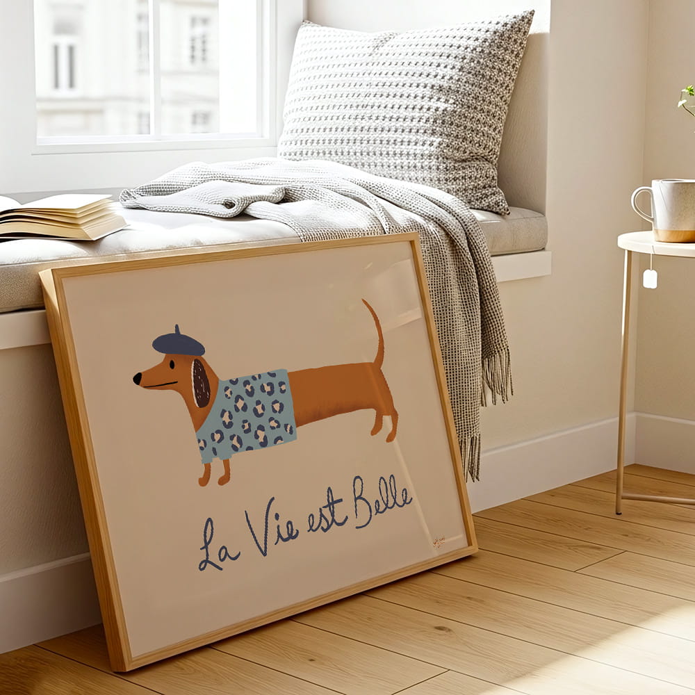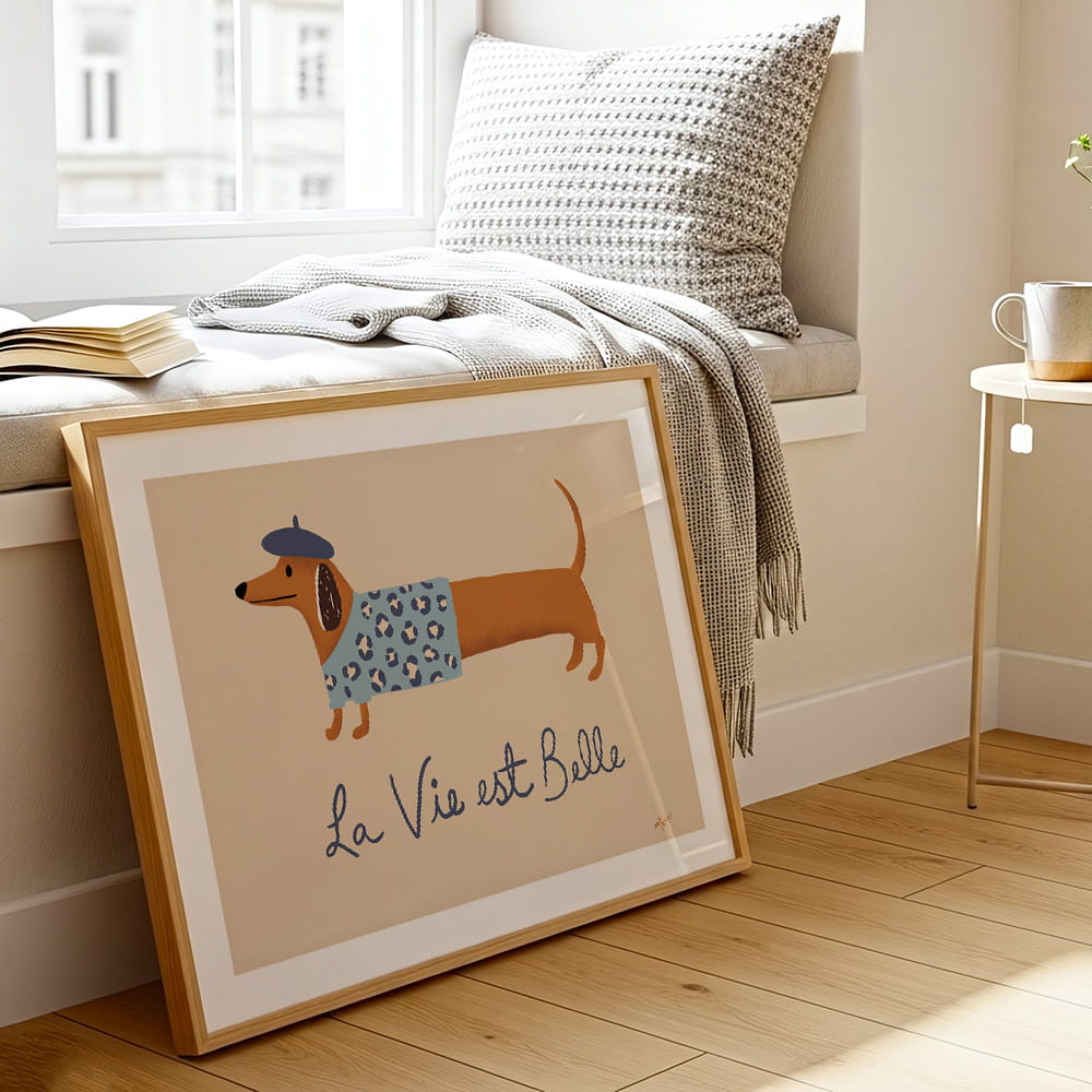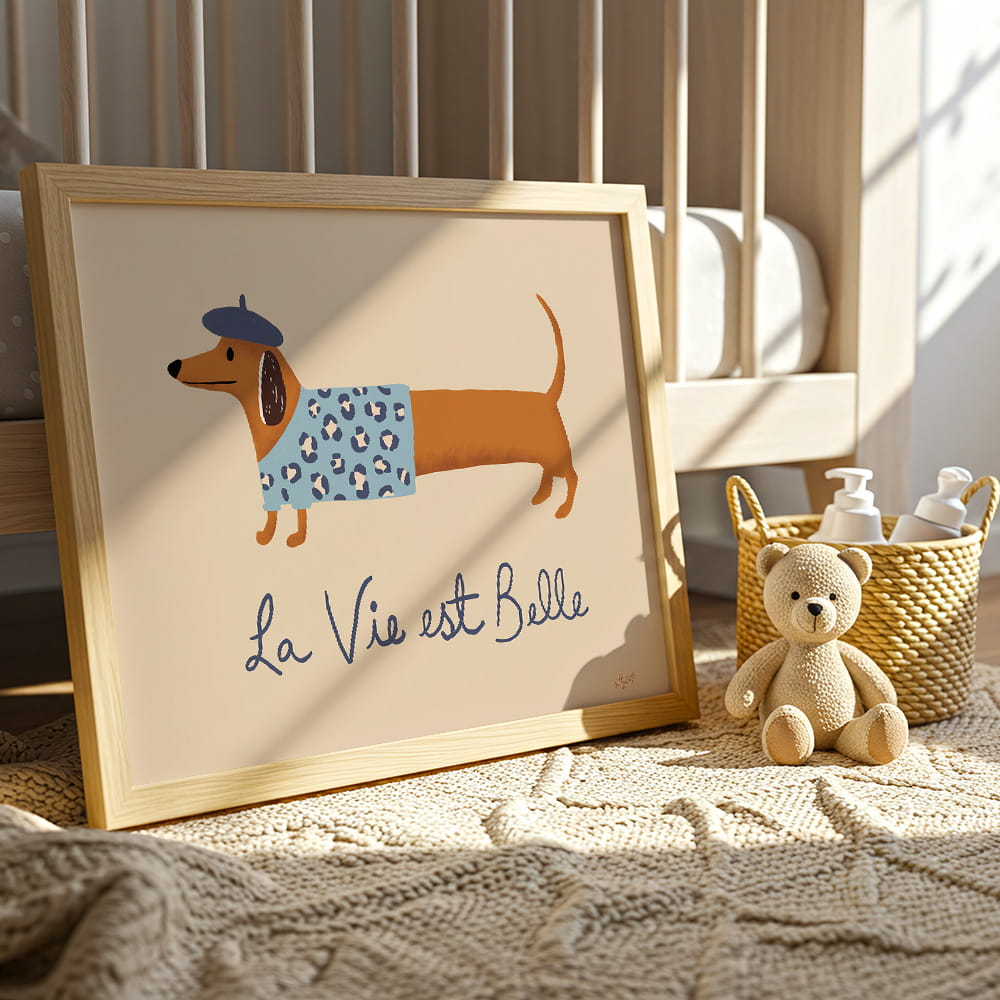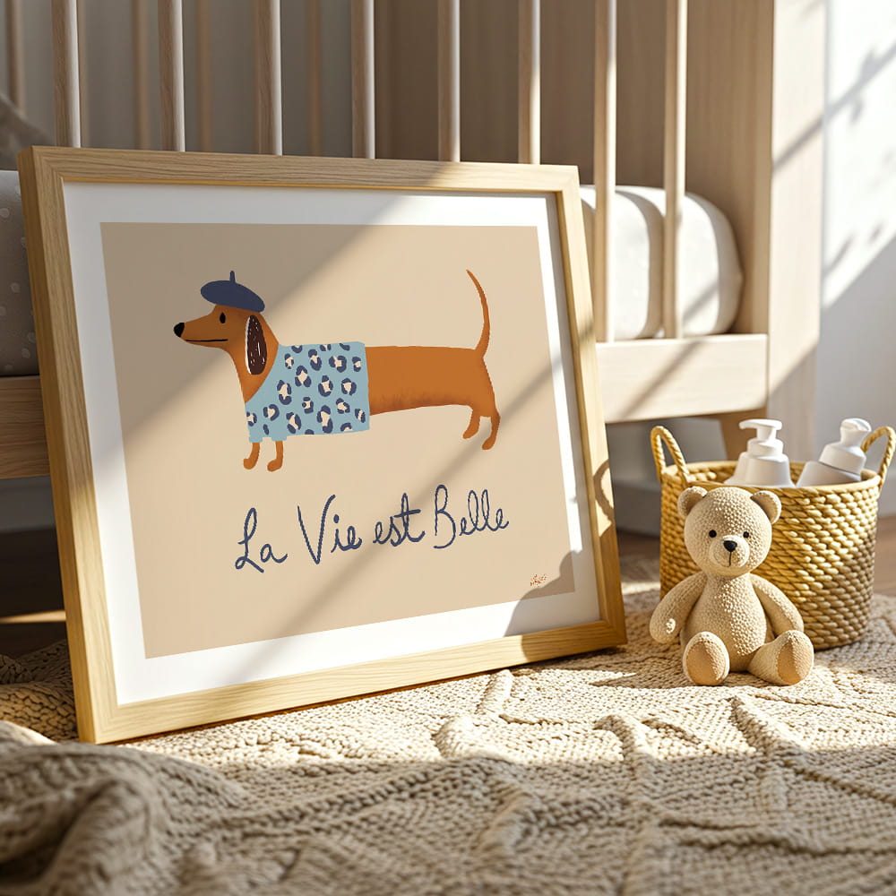 Motyw zwierzęcy doskonale sprawdzi się w aranżacji pokoju malucha, przedszkolaka lub starszego dziecka. Plakat z jamnikiem pasuje do jasnych, naturalnych i nowoczesnych wnętrz, a także świetnie prezentuje się w zestawieniu z innymi ilustracjami zwierząt i plakatami o lekkim, bajkowym charakterze.