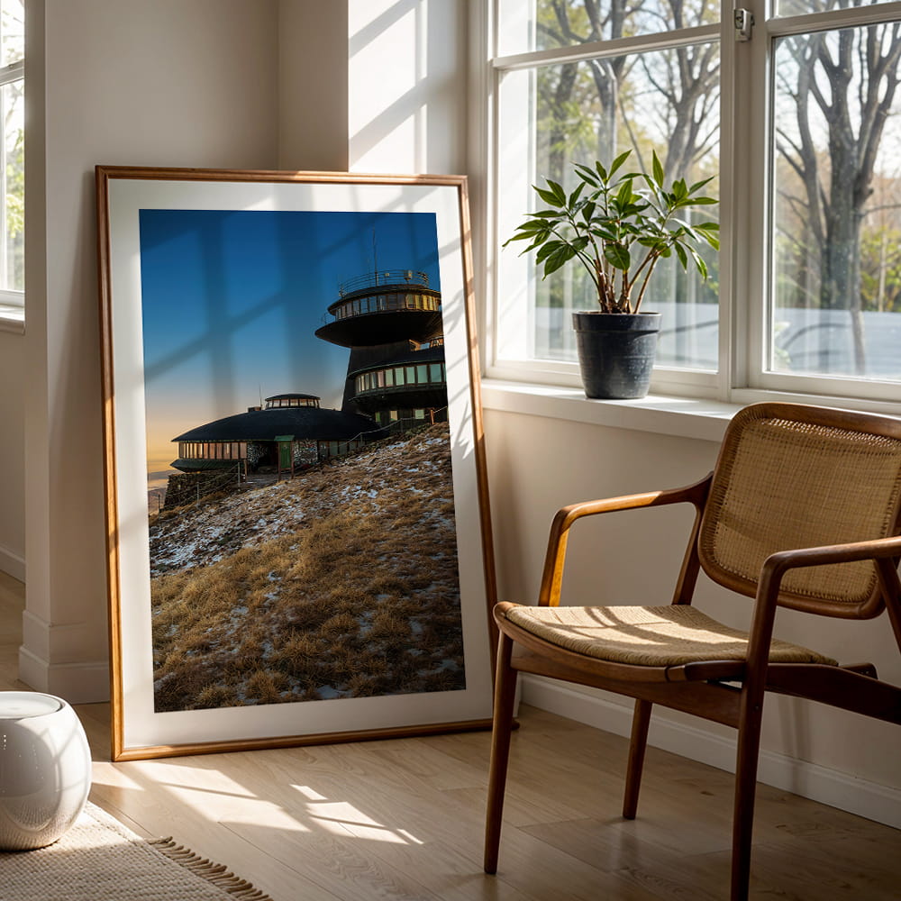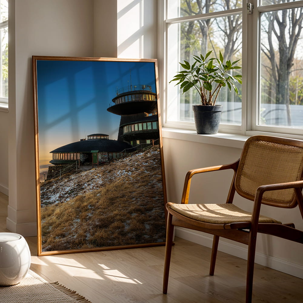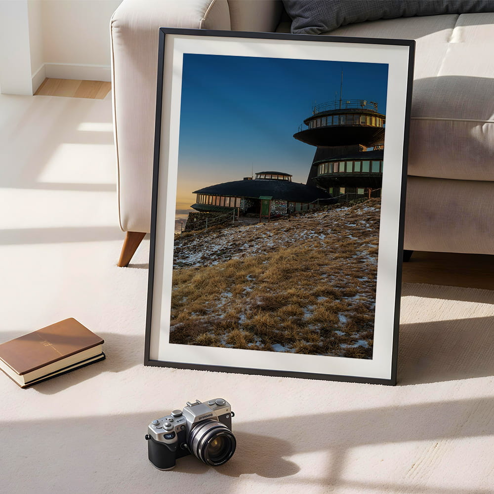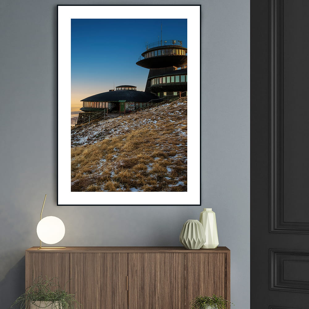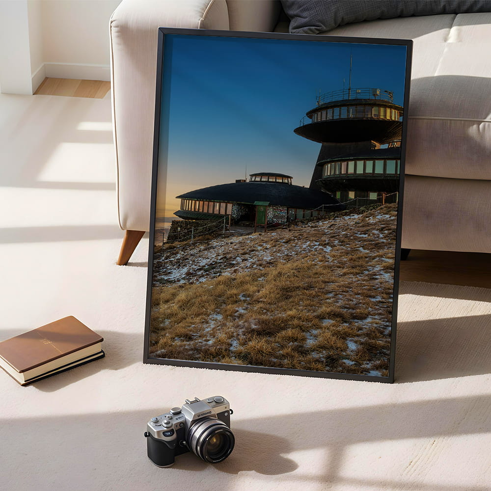 Plakat Karkonosze - zmierzch na Śnieżce przedstawia wyjątkowy widok na obserwatorium położone na najwyższym szczycie Karkonoszy w spokojnej, wieczornej odsłonie. Subtelne światło, chłodne niebo i surowy krajobraz górski tworzą kadr pełen przestrzeni, ciszy i charakterystycznego klimatu Śnieżki.