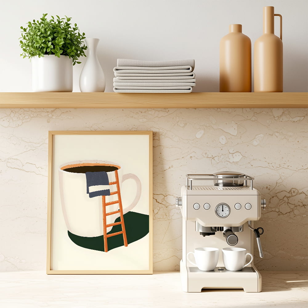 Plakat Kawa na wysokości to wyjątkowa dekoracja ścienna stworzona z myślą o miłośnikach kawy i stylowych wnętrz. Kompozycja inspirowana kawowym klimatem przyciąga uwagę nowoczesną formą i ciekawym zestawieniem kolorów, dzięki czemu plakat staje się nie tylko ozdobą, ale także wyrazistym elementem aranżacji.