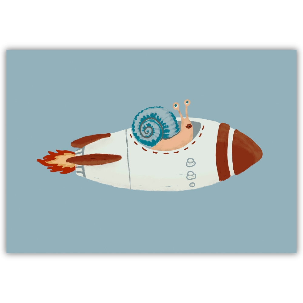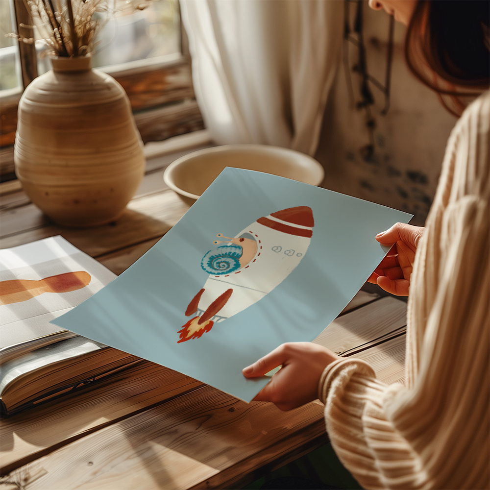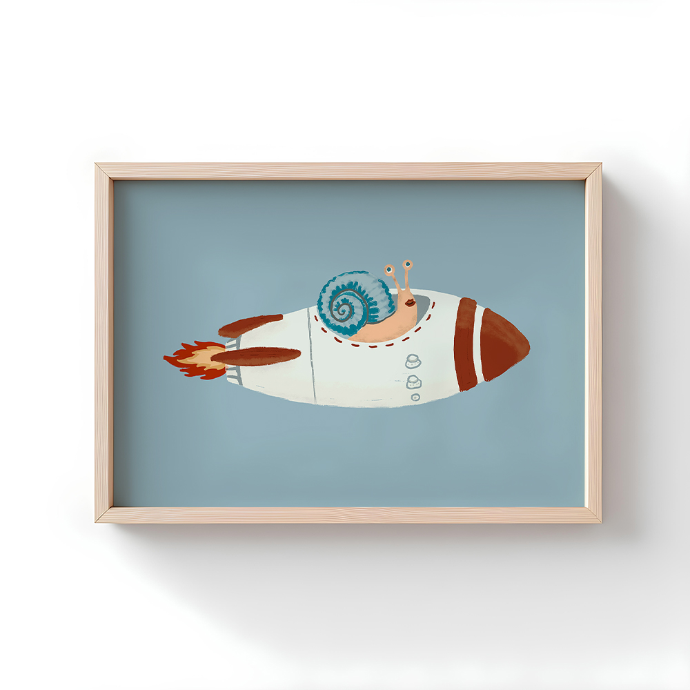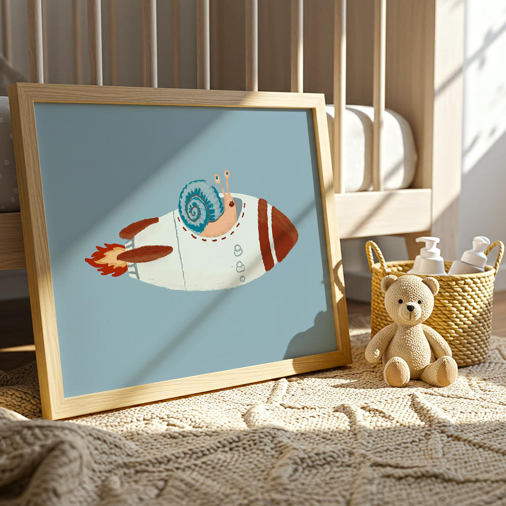 Motyw kosmosu doskonale sprawdza się w aranżacji pokoju dziecka, tworząc przestrzeń sprzyjającą marzeniom, zabawie i odkrywaniu świata. Plakat Kosmiczny Ślimak pięknie prezentuje się zarówno jako pojedyncza ozdoba, jak i element większej galerii ściennej z planetami, rakietami i innymi ilustracjami z serii kosmicznej.