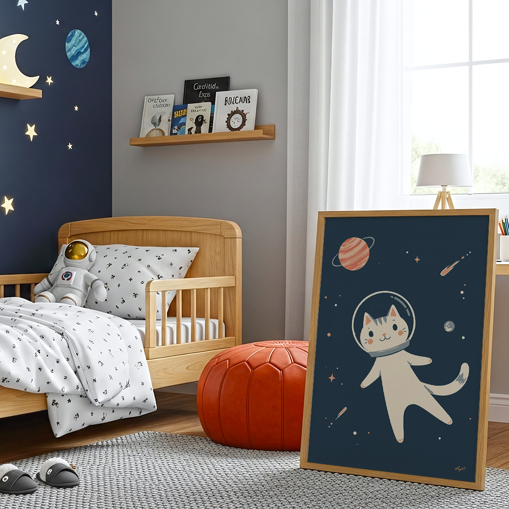 Motyw kosmosu doskonale sprawdzi się w aranżacji pokoju malucha, przedszkolaka lub starszego dziecka. Plakat Kot w Kosmosie pasuje do jasnych, nowoczesnych i dziecięcych wnętrz, a także świetnie prezentuje się jako część większej galerii ściennej z rakietami, planetami i innymi ilustracjami z kosmicznej serii.
