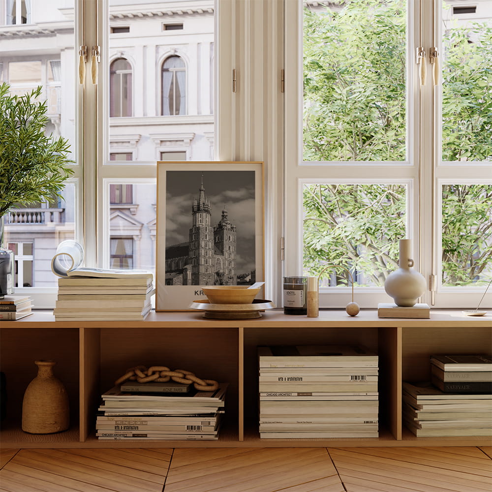Czarno-biały plakat z Kościołem Mariackim to hołd dla architektury, która nie potrzebuje koloru, by opowiadać historię. Znany każdemu widok wież górujących nad Rynkiem Głównym uchwycony w spokojnej, graficznej formie. Z podpisem Kraków - skromnie, ale znacząco. To dekoracja dla tych, którzy lubią, kiedy obraz niesie więcej niż słowa.