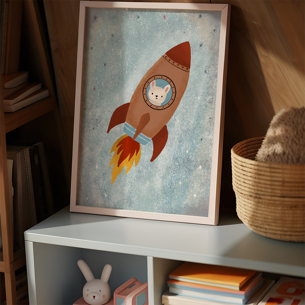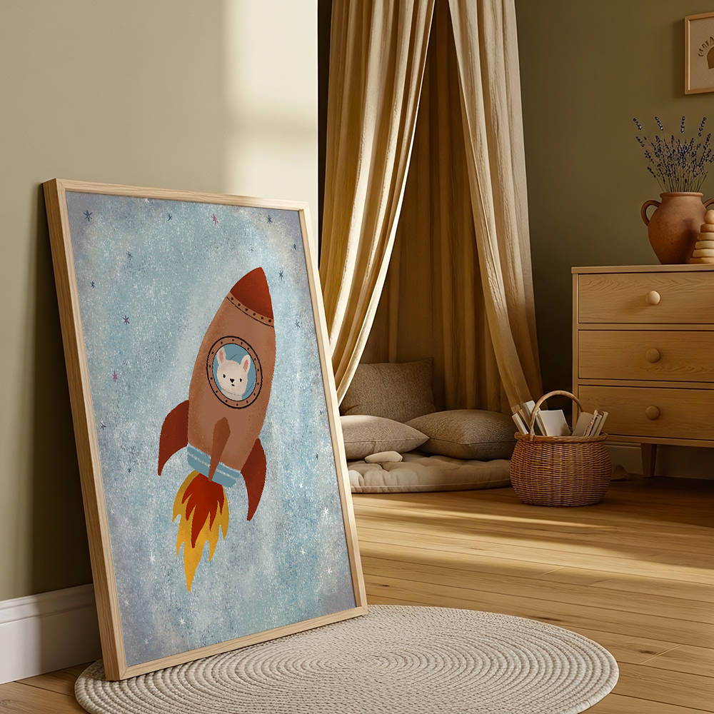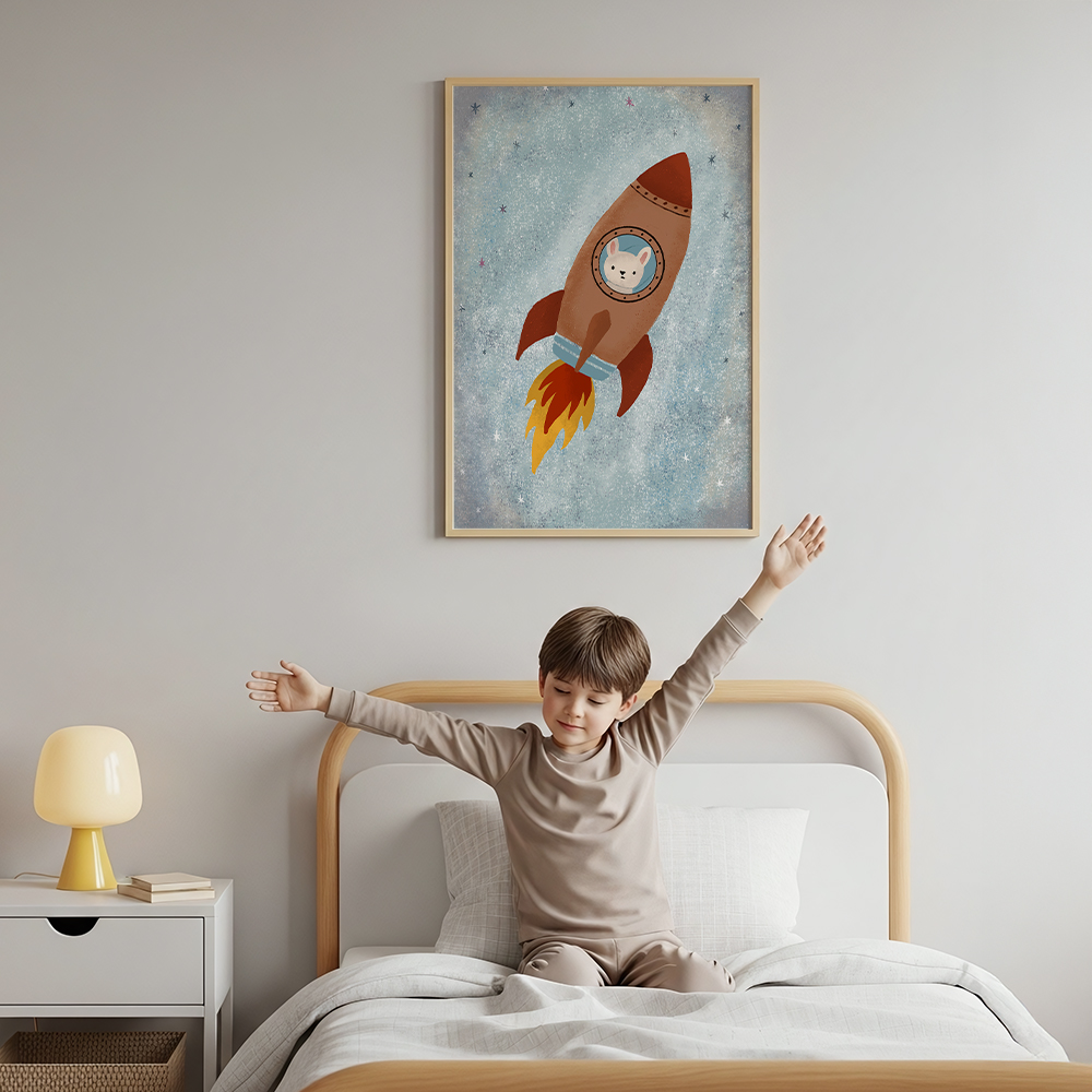To propozycja dla osób, które szukają estetycznych dekoracji do pokoju dziecka, łączących delikatność, ponadczasowy styl i dziecięcy urok. Plakat Królik w rakiecie wprowadza do wnętrza wyobraźnię, pogodny nastrój i subtelny klimat kosmicznej przygody.