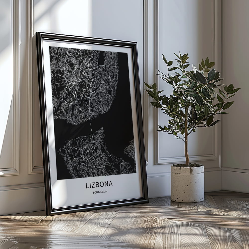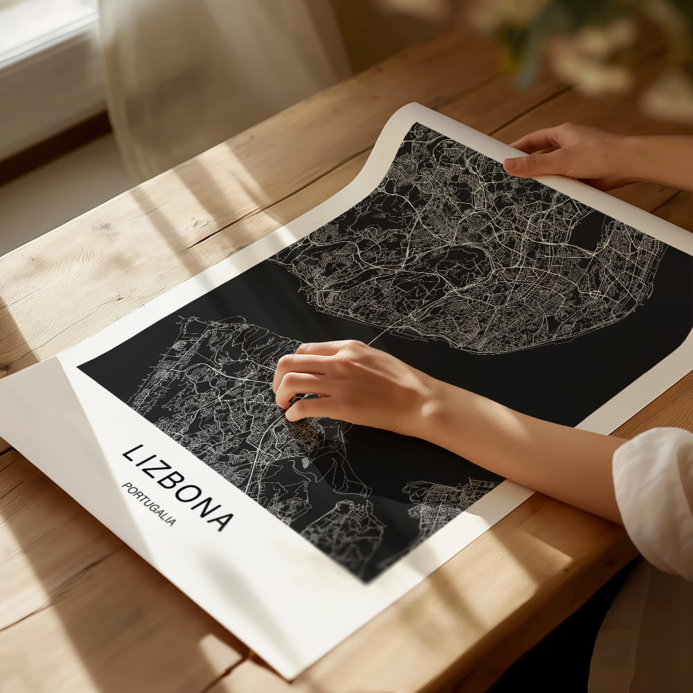 Motyw mapy miasta świetnie sprawdzi się w salonie, sypialni, gabinecie, domowym biurze lub przedpokoju. Plakat z mapą Lizbony pasuje do aranżacji minimalistycznych, industrialnych, loftowych i nowoczesnych, a także dobrze prezentuje się jako element galerii ściennej z innymi plakatami architektonicznymi i miejskimi.