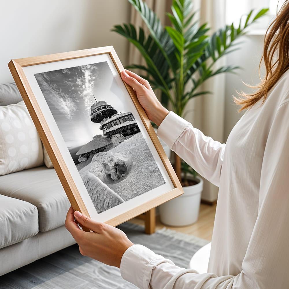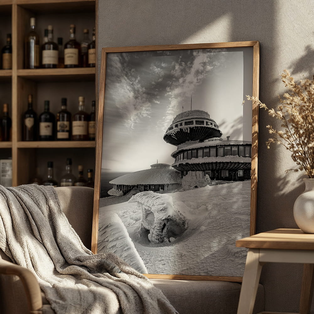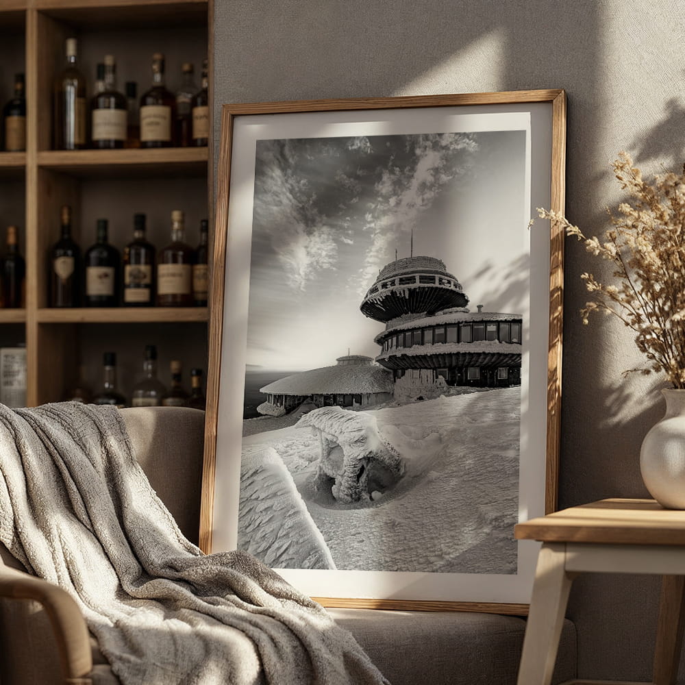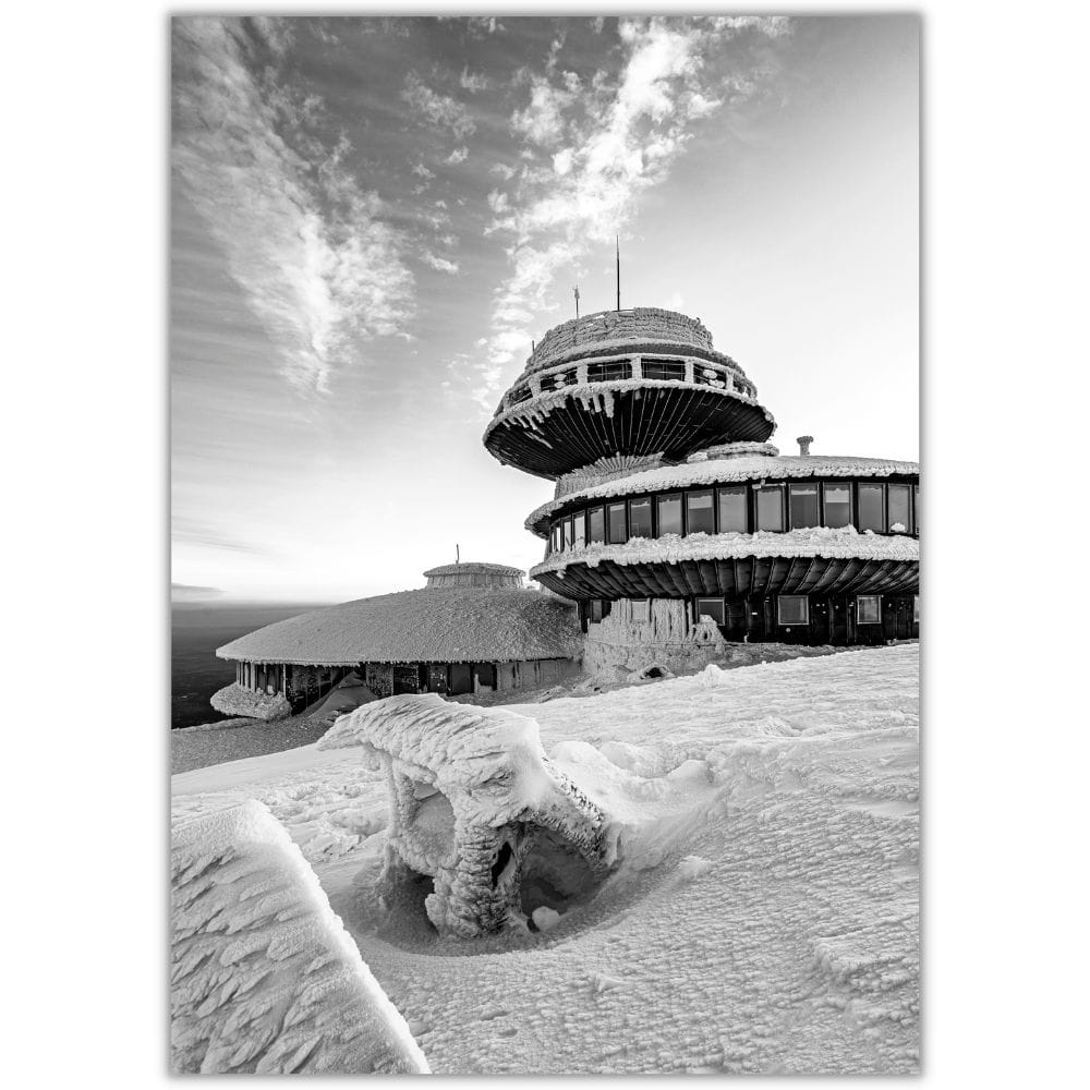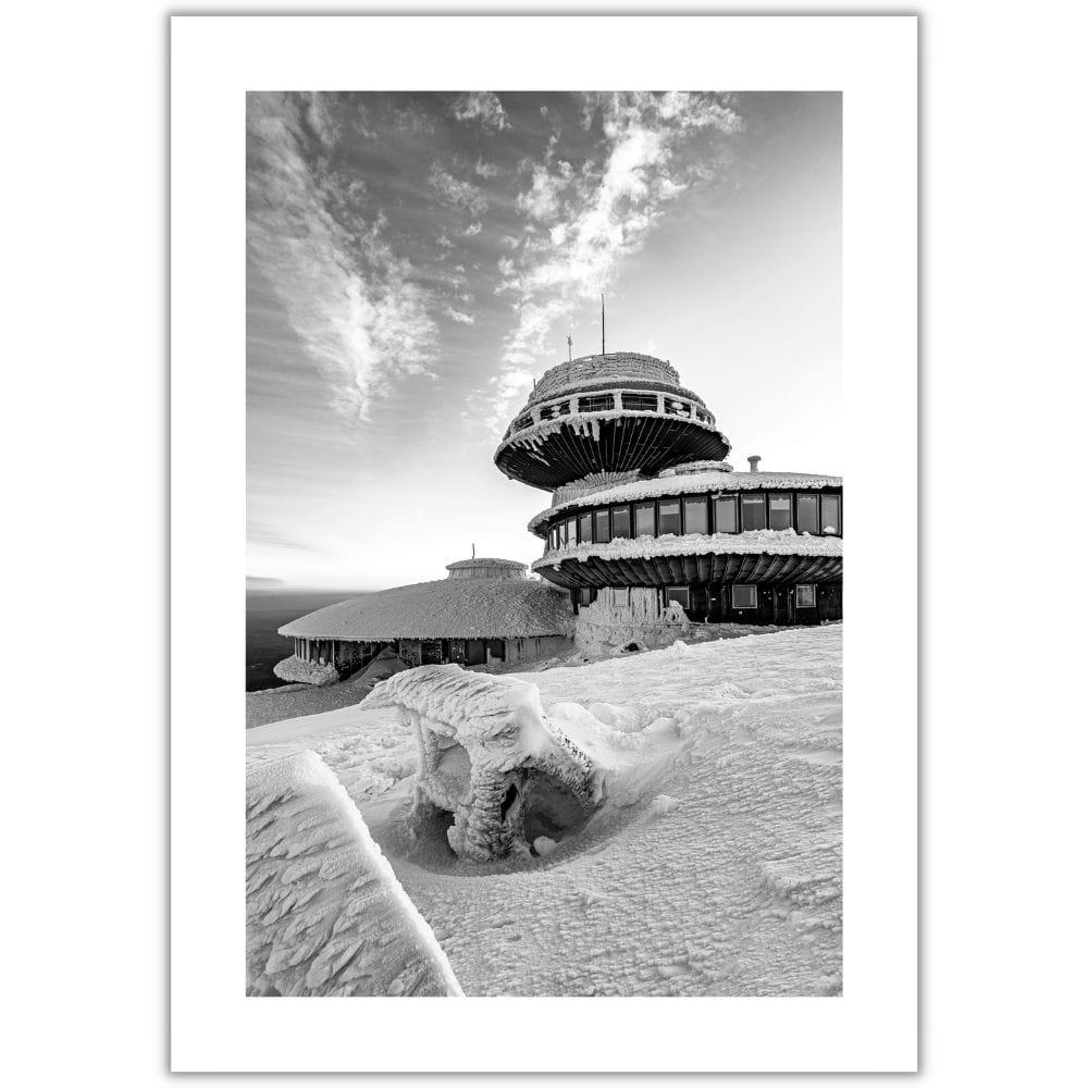 Plakat Karkonosze - obserwatorium na Śnieżce w czerni i bieli przedstawia malowniczy zimowy widok na charakterystyczne obserwatorium położone na najwyższym szczycie Karkonoszy w spokojnej, monochromatycznej odsłonie. Ośnieżona bryła budynku, rozległe niebo i surowy górski krajobraz tworzą kadr pełen kontrastu, przestrzeni i wyjątkowego klimatu karkonoskiej przyrody.