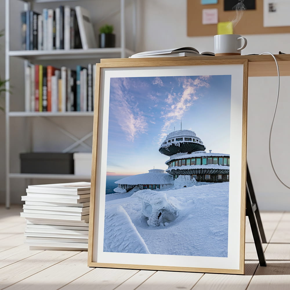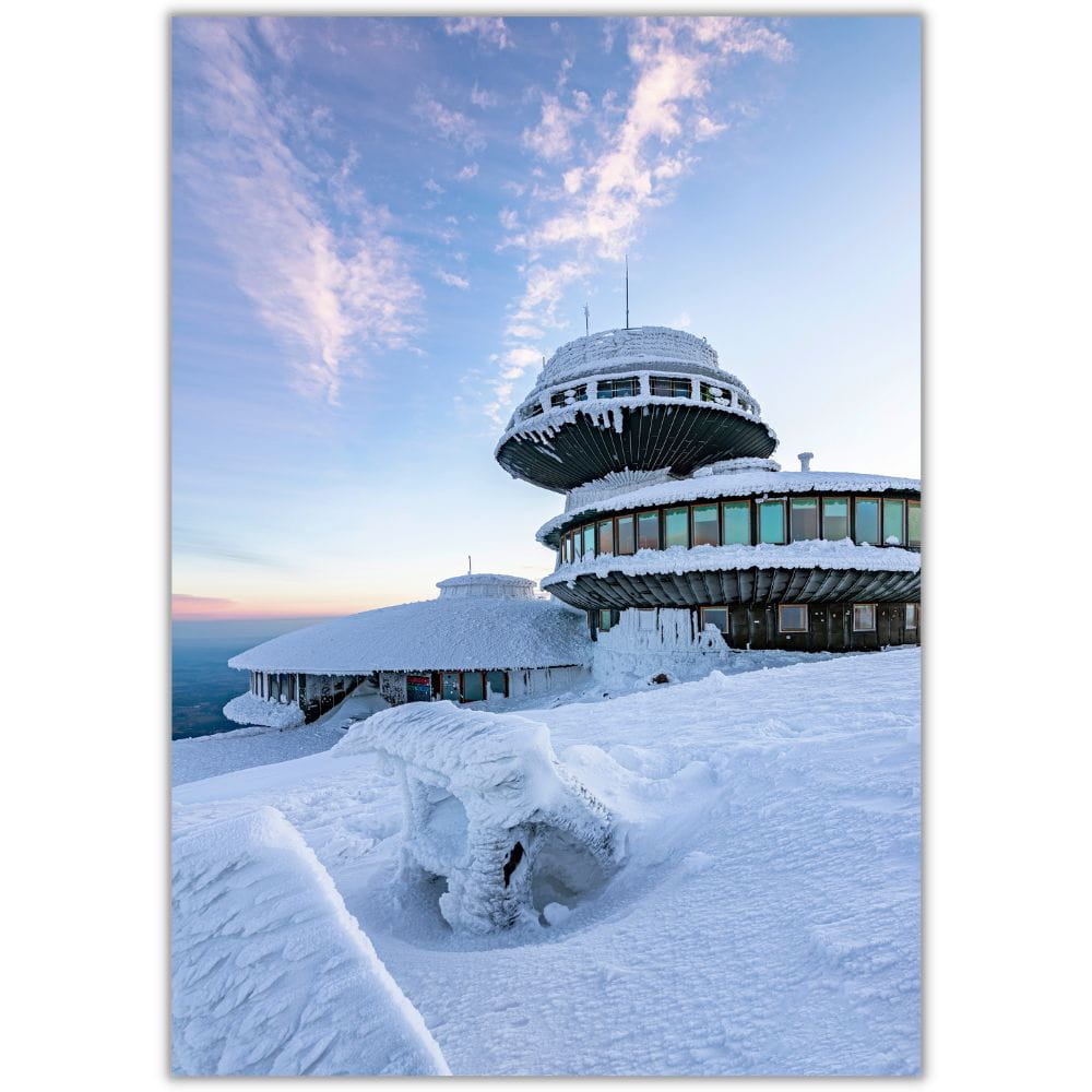 Plakat Karkonosze - obserwatorium na Śnieżce przedstawia malowniczy zimowy widok na charakterystyczne obserwatorium położone na najwyższym szczycie Karkonoszy. Ośnieżona bryła budynku, rozległe niebo i surowy górski krajobraz tworzą kadr pełen światła, przestrzeni i wyjątkowego klimatu karkonoskiej przyrody.