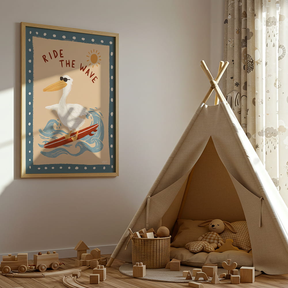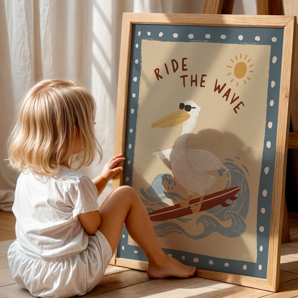 Motyw inspirowany morzem i letnią swobodą doskonale sprawdzi się w pokoju malucha, przedszkolaka lub starszego dziecka. Plakat Pelikan na fali pasuje do aranżacji jasnych, naturalnych i nadmorskich, a także świetnie prezentuje się w zestawieniu z innymi ilustracjami zwierząt, plaży i podróży.