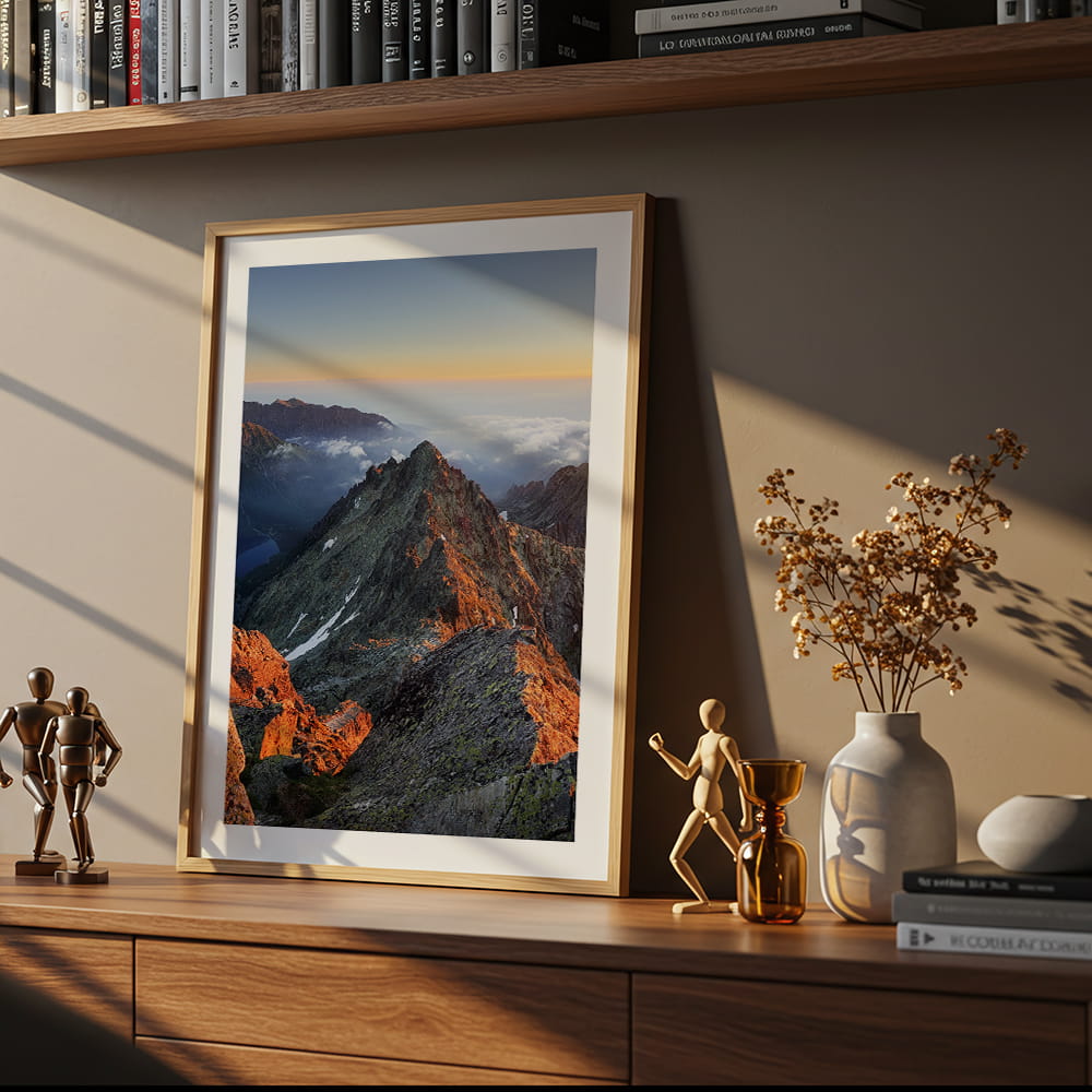 Plakat Tatry - widok z Rysów to stylowa dekoracja ścienna inspirowana potęgą górskiej natury i wyjątkową perspektywą jednego z najbardziej znanych tatrzańskich szczytów. Rozległy krajobraz, surowe grzbiety i światło padające na skały tworzą kompozycję pełną przestrzeni, spokoju i naturalnego piękna.