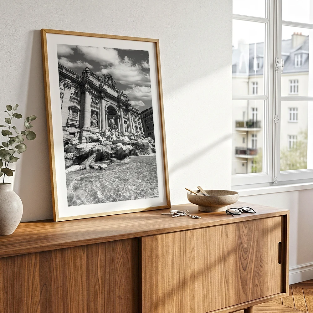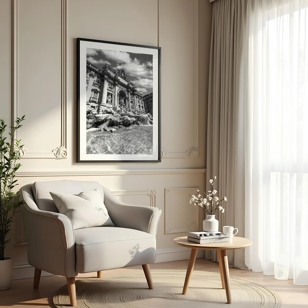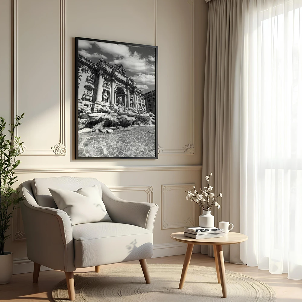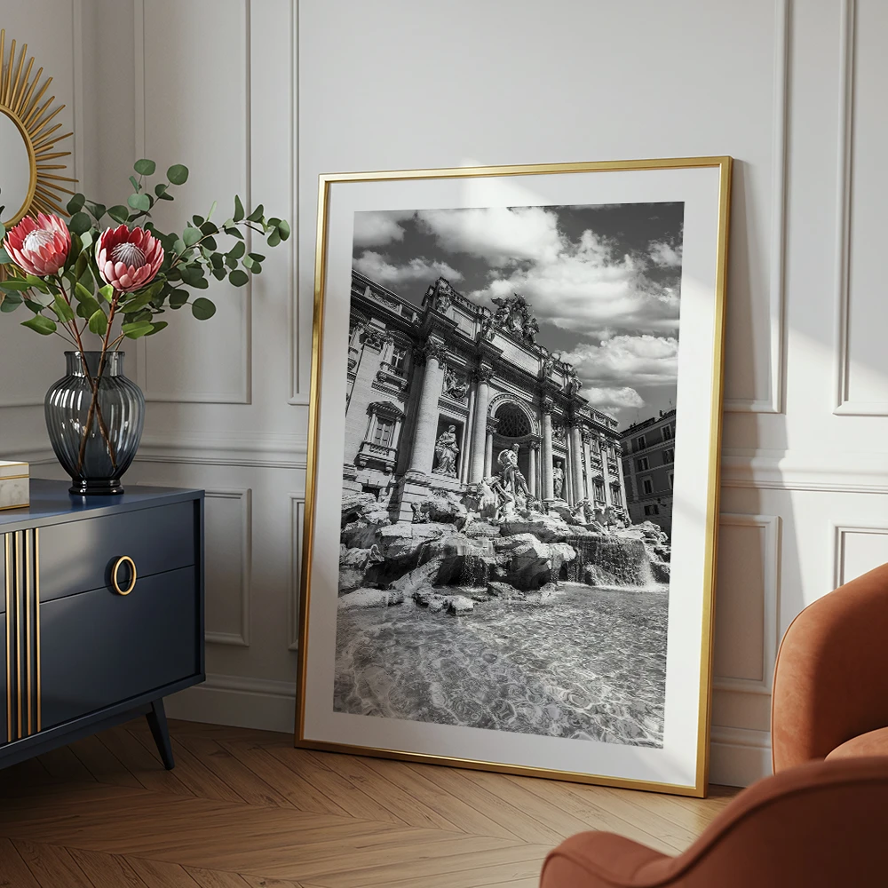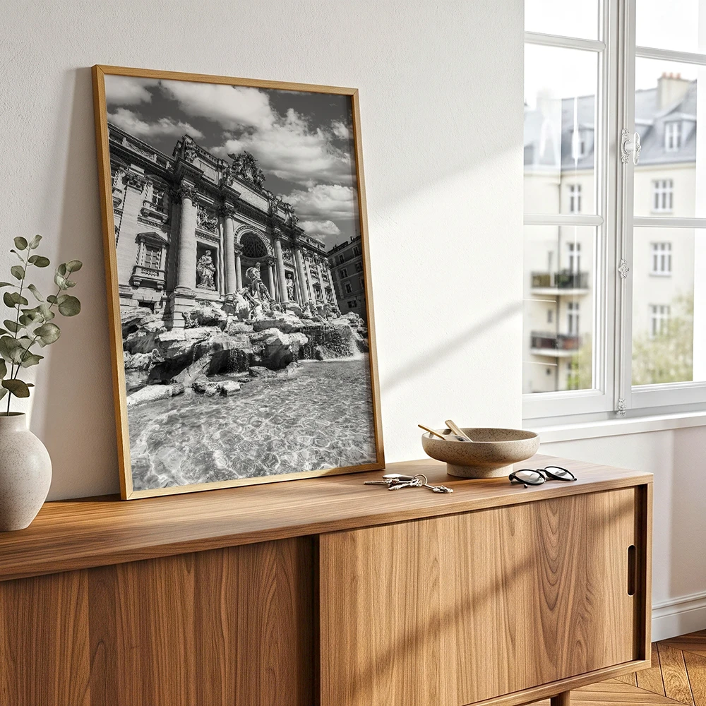 Motyw Rzymu w czarno-białym wydaniu doskonale pasuje do wnętrz nowoczesnych, minimalistycznych, loftowych i klasycznych. To dekoracja ścienna, która wnosi do przestrzeni atmosferę podróży, sztuki i włoskiej estetyki. Plakat Fontanna di Trevi będzie także świetnym pomysłem na prezent dla miłośników Rzymu, architektury i stylowych dodatków do domu.