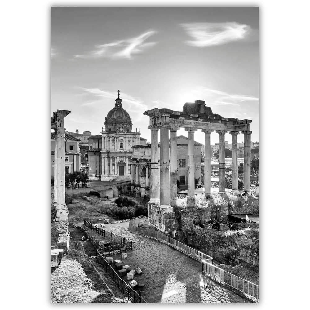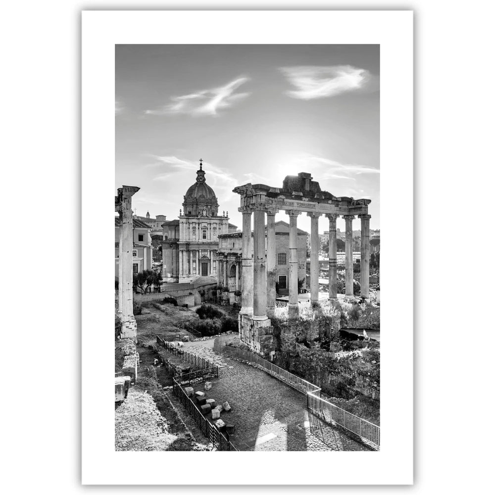Plakat Rzym - Forum Romanum w czerni i bieli przedstawia jedno z najbardziej symbolicznych miejsc Wiecznego Miasta w spokojnej, szlachetnej odsłonie. Antyczne kolumny, kamienne ścieżki i historyczna zabudowa tworzą kadr pełen rytmu, światła i architektonicznej harmonii.