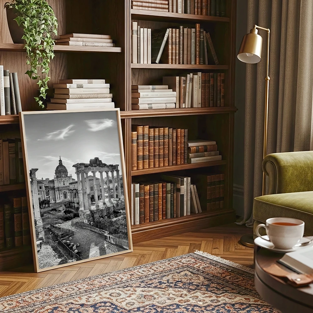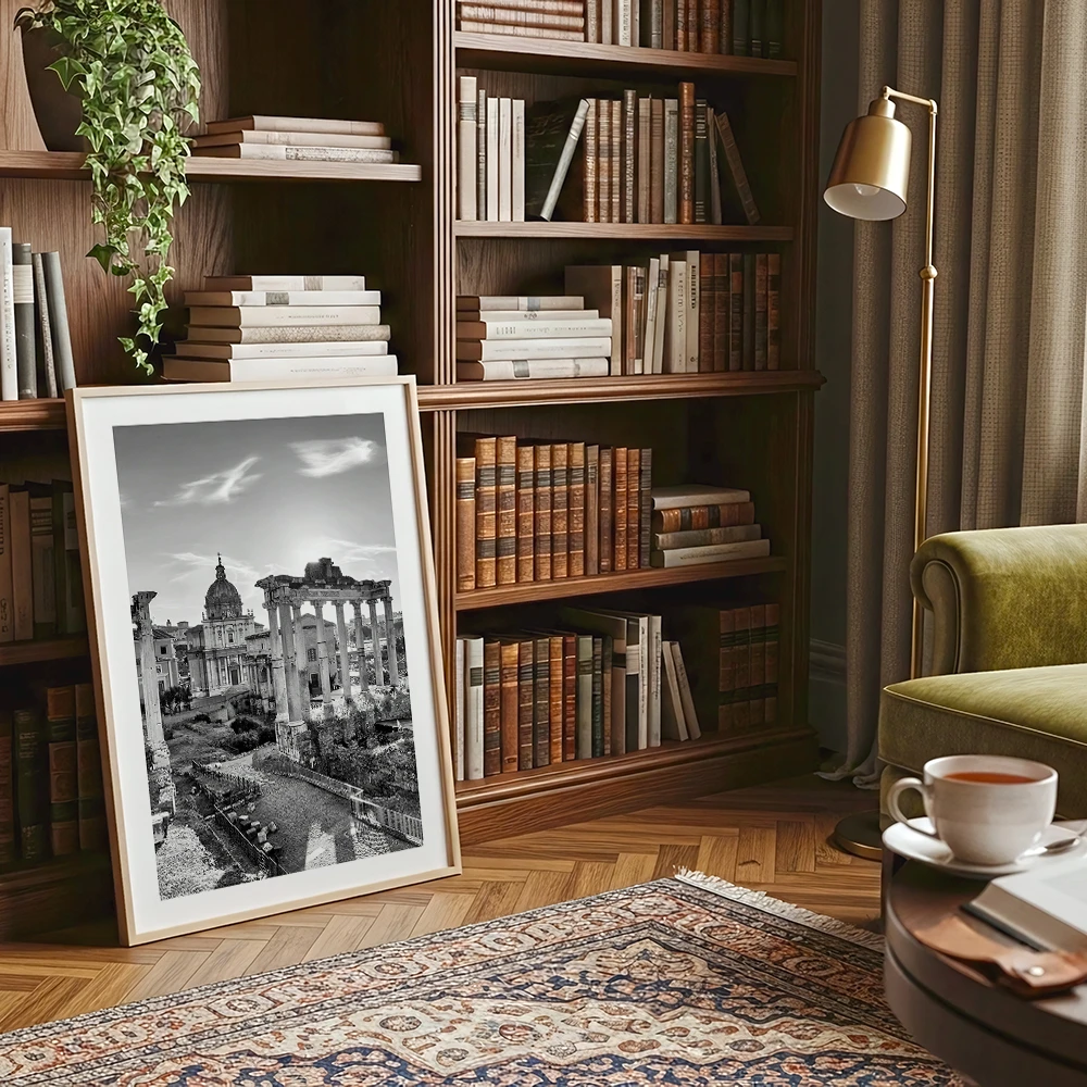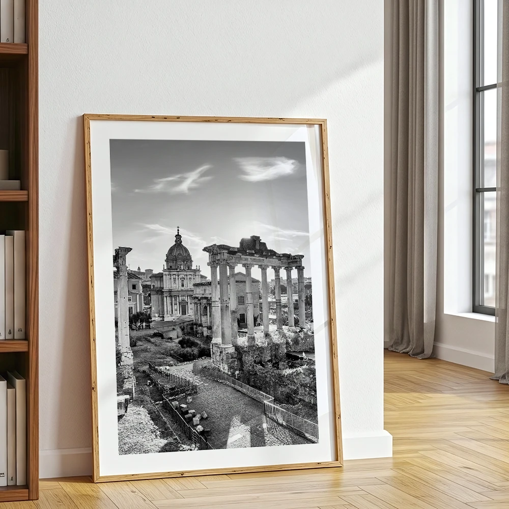 Plakat Rzym - Forum Romanum w czerni i bieli świetnie sprawdzi się w salonie, gabinecie, bibliotece lub sypialni. Pasuje do aranżacji nowoczesnych, klasycznych, loftowych i minimalistycznych, szczególnie tam, gdzie liczy się fotografia, detal i dekoracja z wyraźną tożsamością.