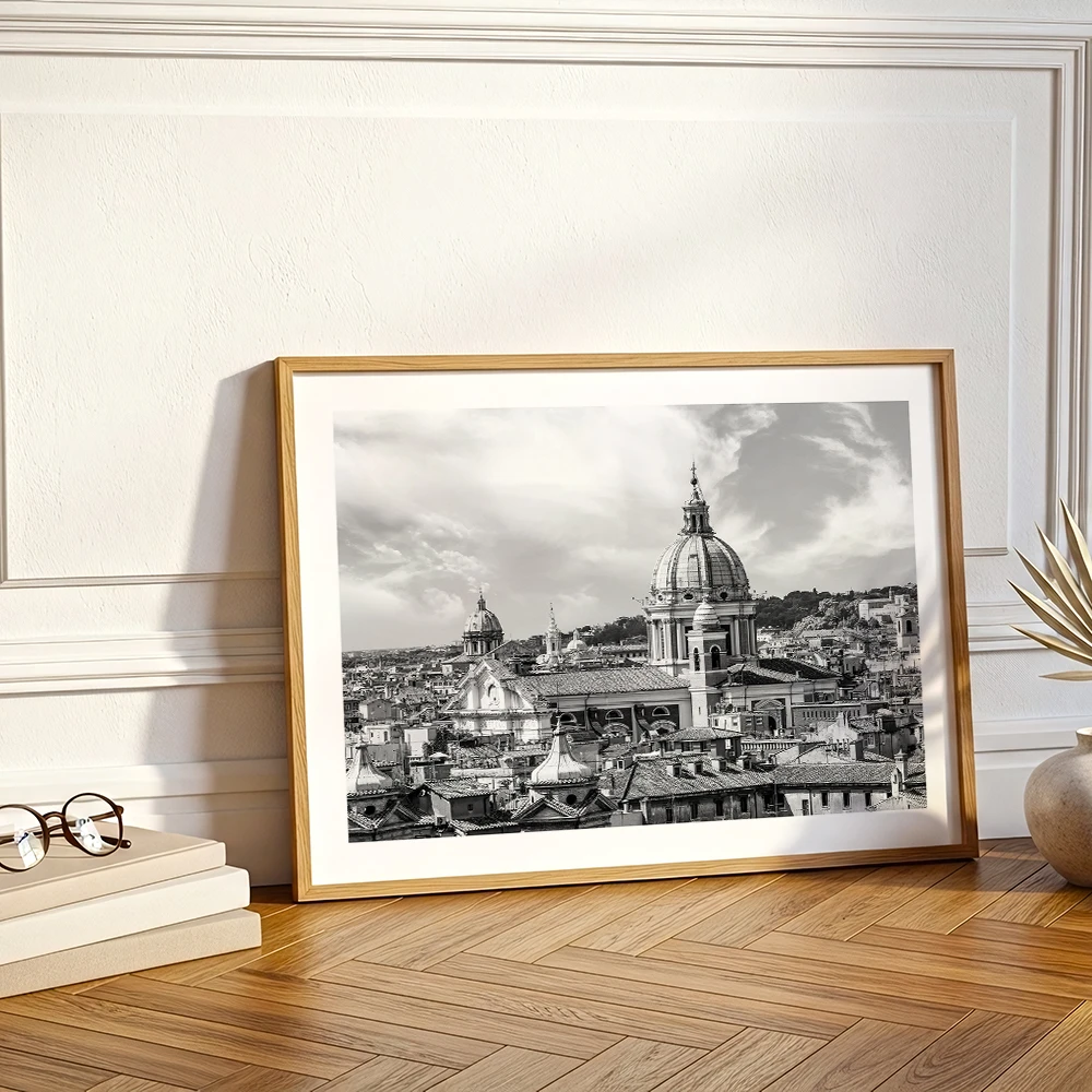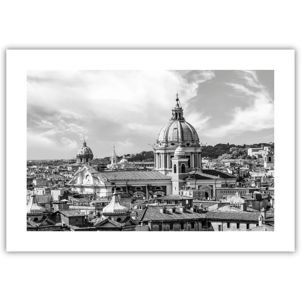 Plakat Rzym - rzymska panorama w czerni i bieli pokazuje Wieczne Miasto z perspektywy, która pozwala uchwycić jego wyjątkowy rytm i architektoniczną tożsamość. Gęsta zabudowa, charakterystyczne dachy oraz monumentalne kopuły tworzą spójną, pełną detali kompozycję, która przyciąga uwagę spokojem i elegancją.