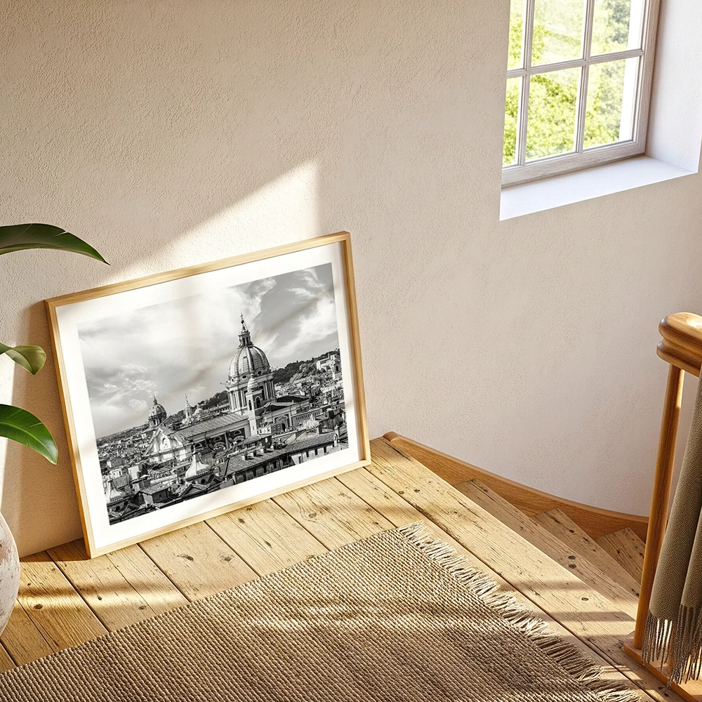 Czarno-biała estetyka wydobywa z tego kadru to, co najbardziej wyraziste - fakturę miejskiej tkanki, kontrasty światła i klasyczne proporcje rzymskiej architektury. Dzięki temu plakat nie tylko dekoruje wnętrze, ale też buduje nastrój inspirowany historią, kulturą i ponadczasowym pięknem Rzymu.