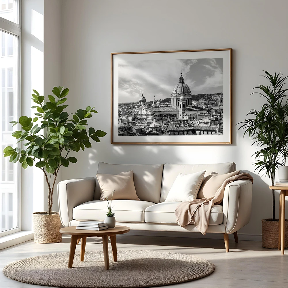 Plakat Rzym - rzymska panorama w czerni i bieli świetnie sprawdzi się w salonie, gabinecie, sypialni lub przedpokoju. To doskonały wybór do wnętrz nowoczesnych, minimalistycznych, klasycznych i loftowych, szczególnie dla osób, które cenią miejskie pejzaże, fotografię czarno-białą i dekoracje ścienne z charakterem.