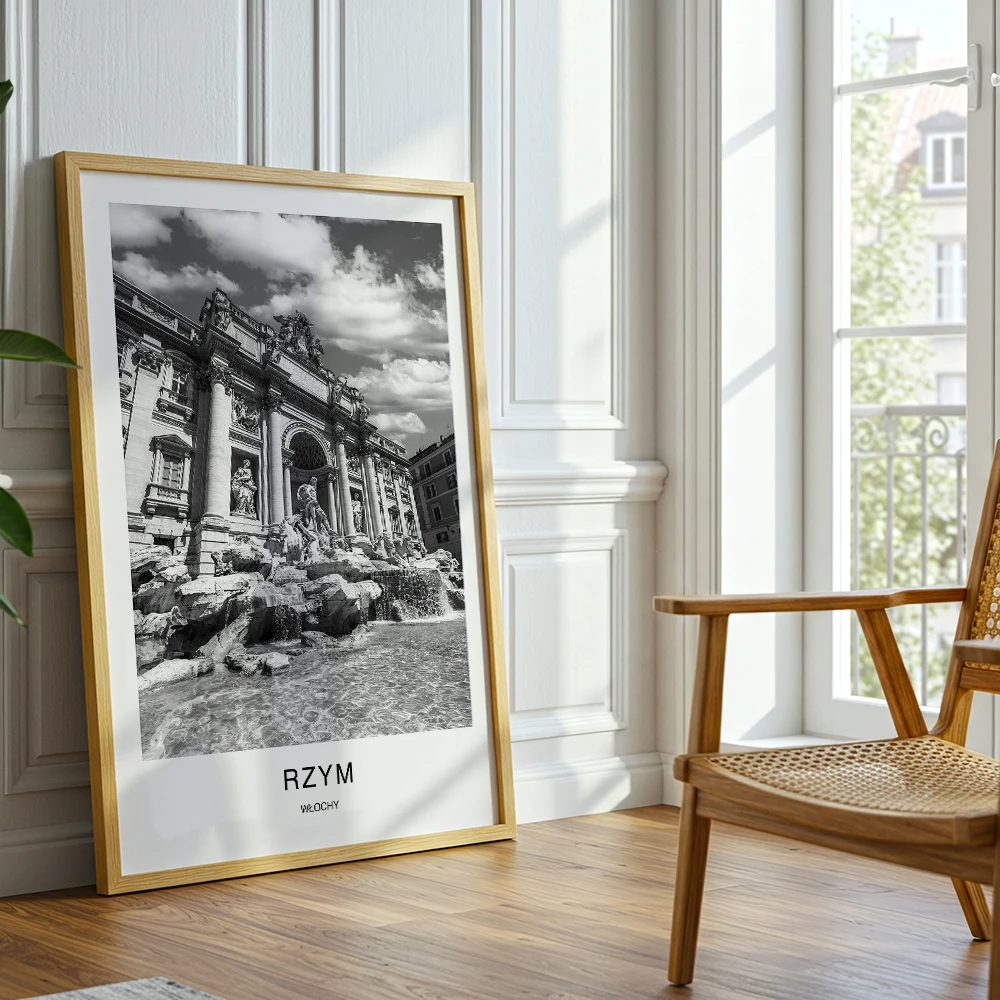 Plakat Rzym Włochy - Fontanna di Trevi to wyjątkowa dekoracja ścienna, która łączy klasyczne piękno rzymskiej architektury z nowoczesną formą plakatu z napisem. Czarno-biała fotografia Fontanny di Trevi podkreśla monumentalność zabytku, a typograficzny podpis z nazwą miasta i kraju nadaje kompozycji uporządkowany, designerski wygląd.