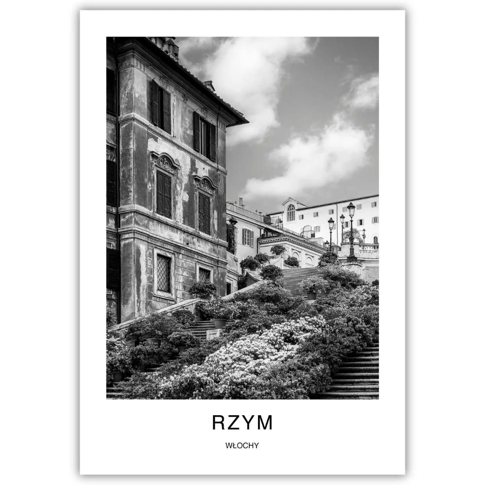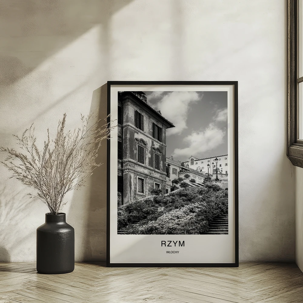 Plakat Rzym Włochy - Schody Hiszpańskie to stylowa dekoracja ścienna inspirowana jednym z najbardziej znanych miejsc w stolicy Włoch. Ujęcie Schodów Hiszpańskich w czarno-białej odsłonie podkreśla detale architektury i nadaje kompozycji elegancki, ponadczasowy wyraz. Napis umieszczony na plakacie wzmacnia jego podróżniczy charakter i dodaje całości nowoczesnej lekkości.