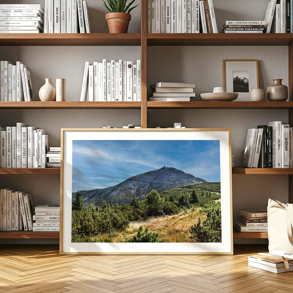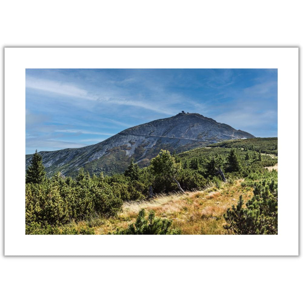 Plakat Karkonosze - Śnieżka przedstawia majestatyczny widok na najwyższy szczyt Karkonoszy w spokojnej, naturalnej odsłonie. Górski pejzaż, rozległe niebo i charakterystyczna sylwetka Śnieżki tworzą kadr pełen przestrzeni, światła i wyjątkowego klimatu karkonoskiej przyrody.