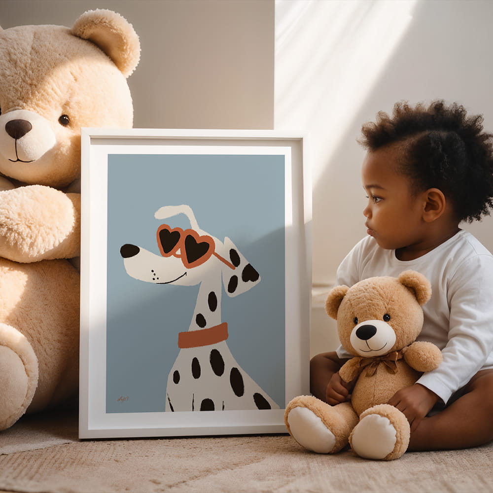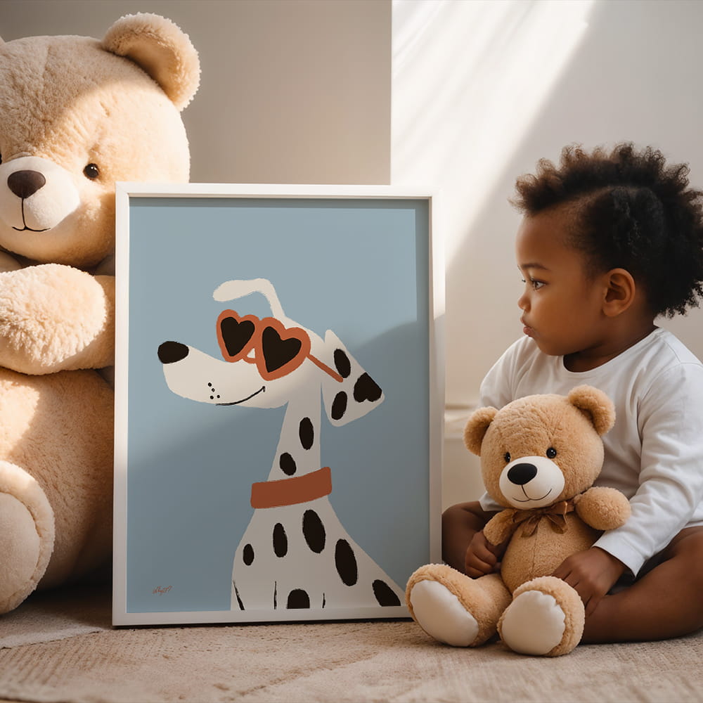 Plakat Stylowy Dalmatyńczyk to dekoracja ścienna stworzona z myślą o dziecięcych wnętrzach, w których liczy się lekkość, ciepło i przyjazny charakter. Motyw uroczego dalmatyńczyka przedstawiony w estetycznej, stylowej formie tworzy plakat, który doskonale odnajduje się w pokoju dziecka.