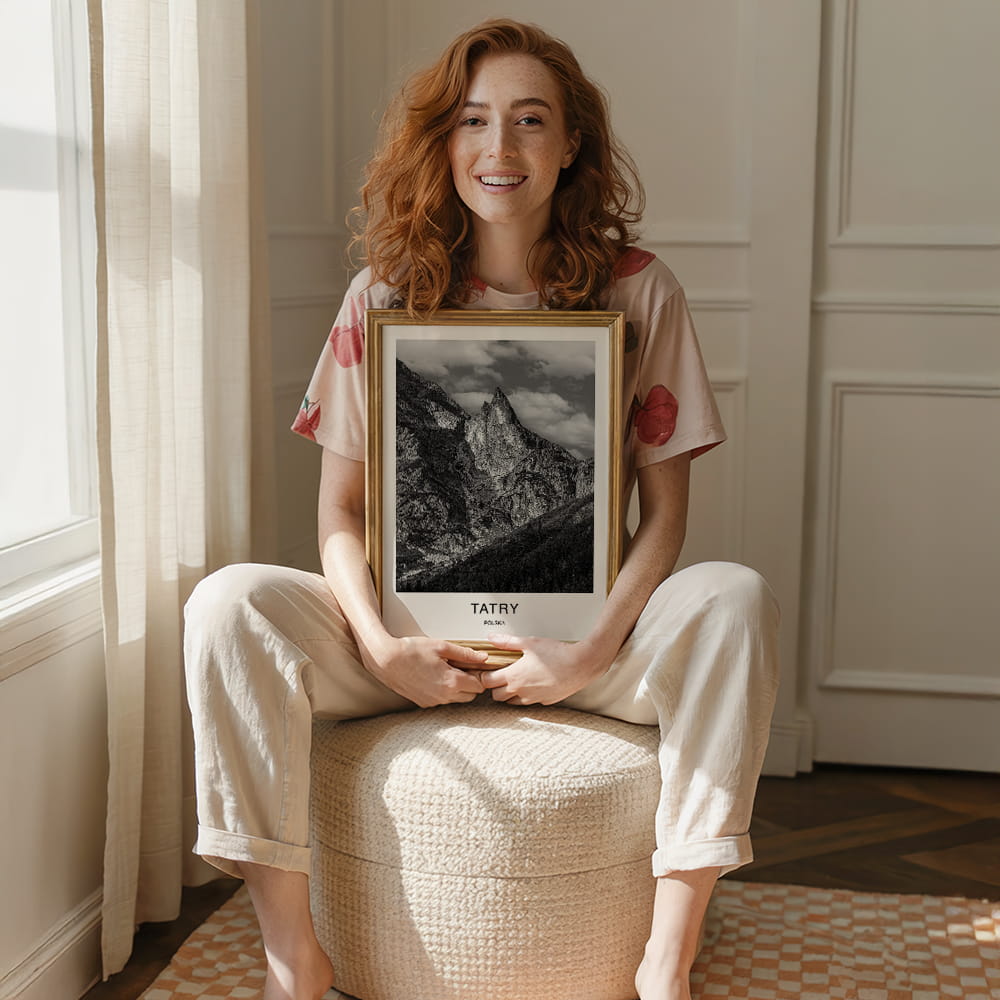 Czarno-biała fotografia podkreśla strukturę skał oraz dramatyczny charakter wysokogórskiego pejzażu. Minimalistyczna estetyka nadaje plakatowi elegancki i ponadczasowy wygląd.