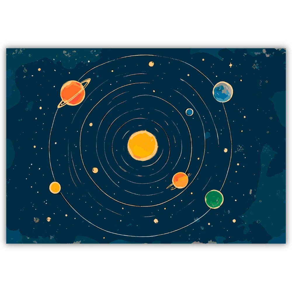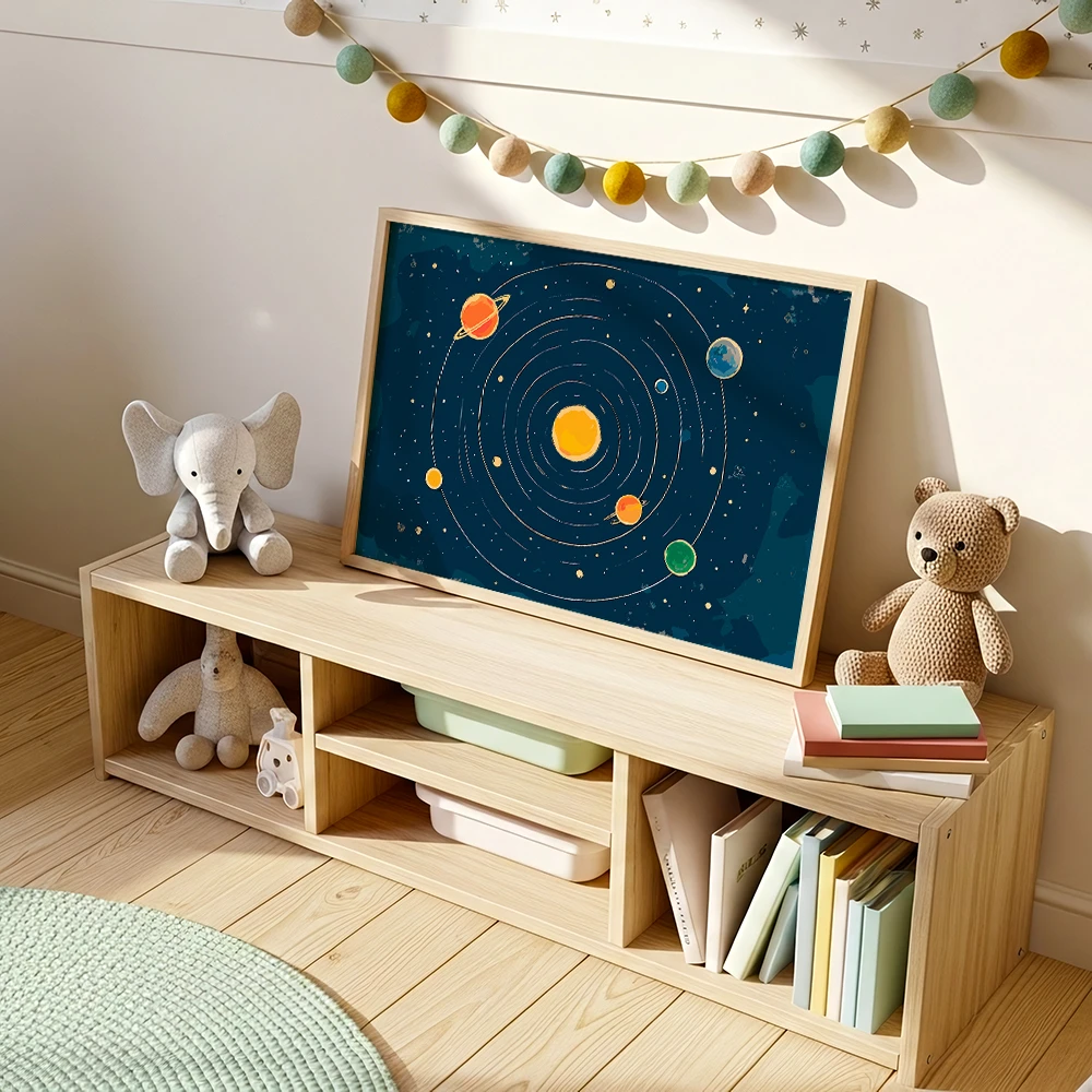 Plakat Układ Słoneczny to dekoracja ścienna, która przenosi dziecięcą wyobraźnię do fascynującego świata planet, gwiazd i kosmicznych odkryć. Bajkowa ilustracja przedstawiająca planety krążące wokół słońca przyciąga uwagę prostą, estetyczną formą i tworzy w pokoju dziecka inspirujący, spokojny oraz pełen wyobraźni klimat.