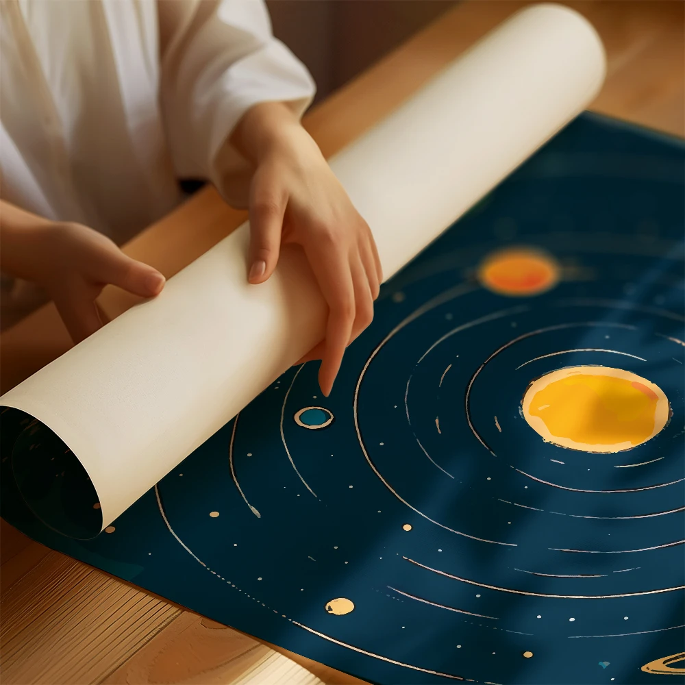 Motyw kosmosu doskonale sprawdzi się w aranżacji pokoju malucha, przedszkolaka lub starszego dziecka. Plakat Układ Słoneczny pasuje do jasnych, nowoczesnych i dziecięcych wnętrz, a także świetnie prezentuje się jako część większej galerii ściennej z rakietami, astronautami i innymi ilustracjami z kosmicznej serii.