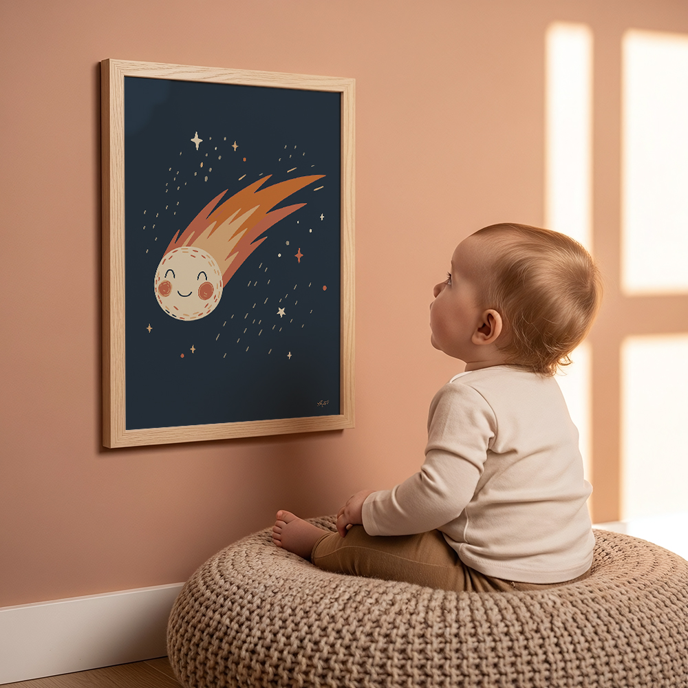 To propozycja dla osób, które szukają estetycznych dekoracji do pokoju dziecka, łączących delikatność, ponadczasowy styl i pogodny charakter. Plakat Wesoła Kometa wnosi do wnętrza ciepło, pobudza wyobraźnię i staje się pięknym akcentem w codziennej przestrzeni dziecka.