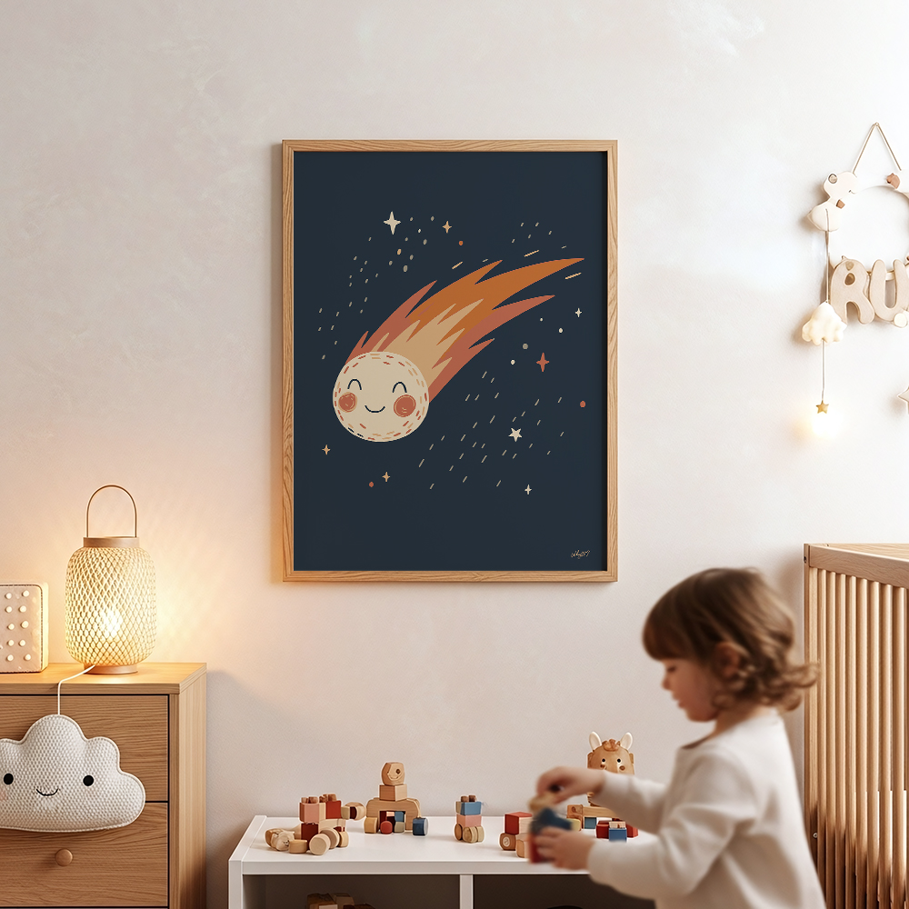 Motyw kosmosu i nocnego nieba doskonale sprawdzi się w aranżacji pokoju malucha, przedszkolaka lub starszego dziecka. Plakat Wesoła Kometa pasuje do jasnych, naturalnych i dziecięcych wnętrz, a także świetnie prezentuje się jako część większej galerii ściennej z planetami, gwiazdami i innymi ilustracjami z kosmicznej serii.