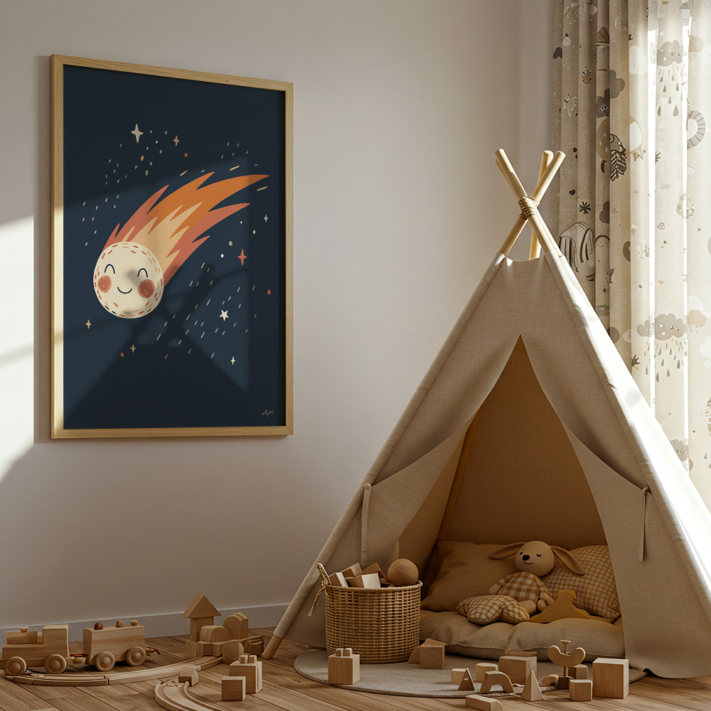 Plakat Wesoła Kometa to dekoracja ścienna, która wnosi do wnętrza pogodny nastrój, dziecięcy urok i bajkowy klimat. Urocza ilustracja uśmiechniętej komety przyciąga uwagę prostą, przyjazną formą i tworzy w pokoju dziecka atmosferę pełną radości, wyobraźni oraz lekkości.