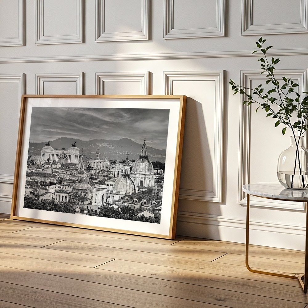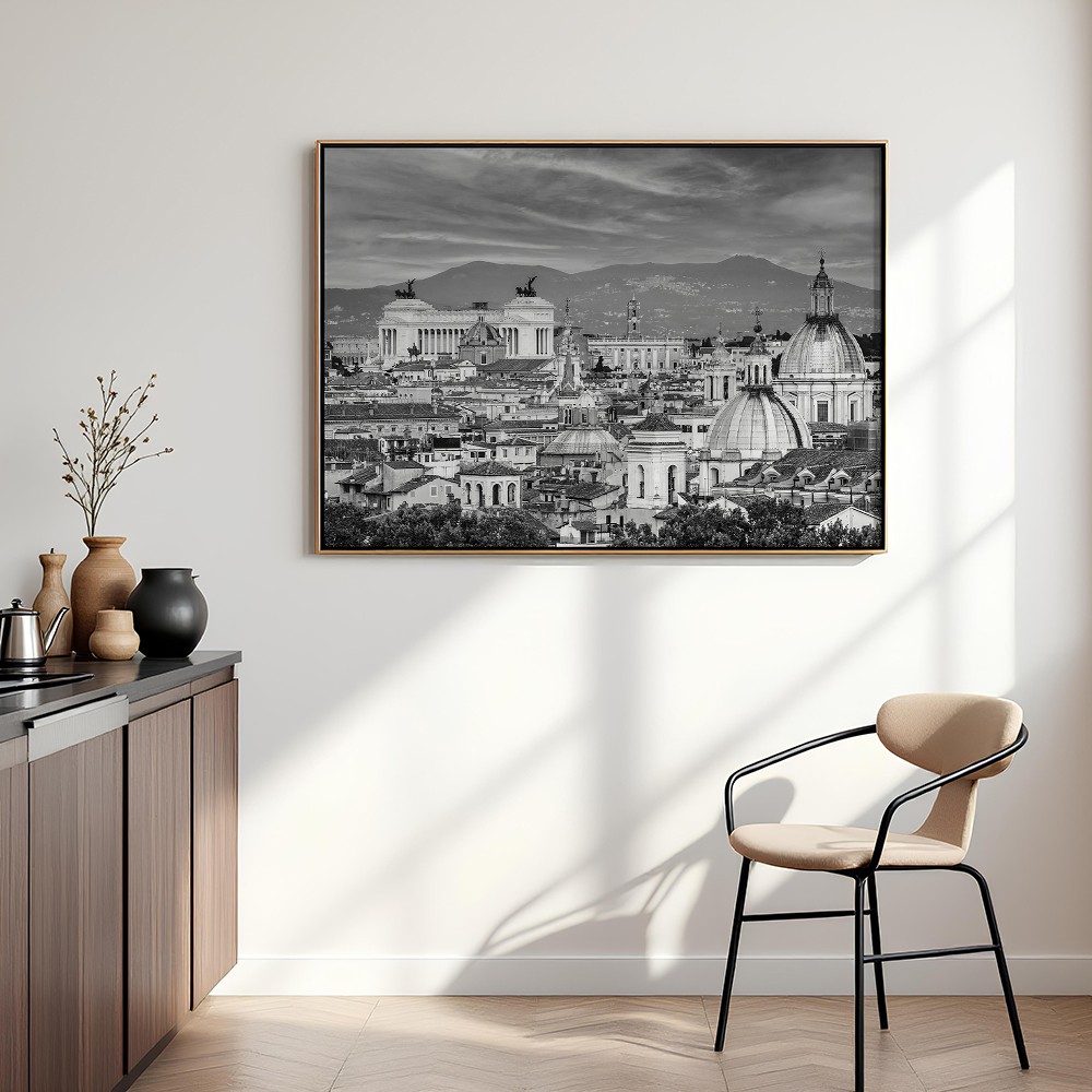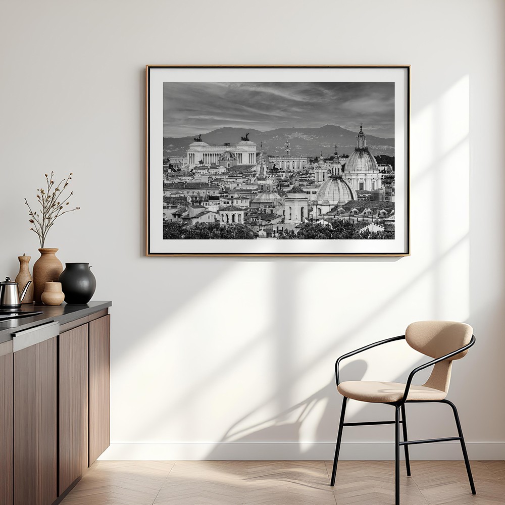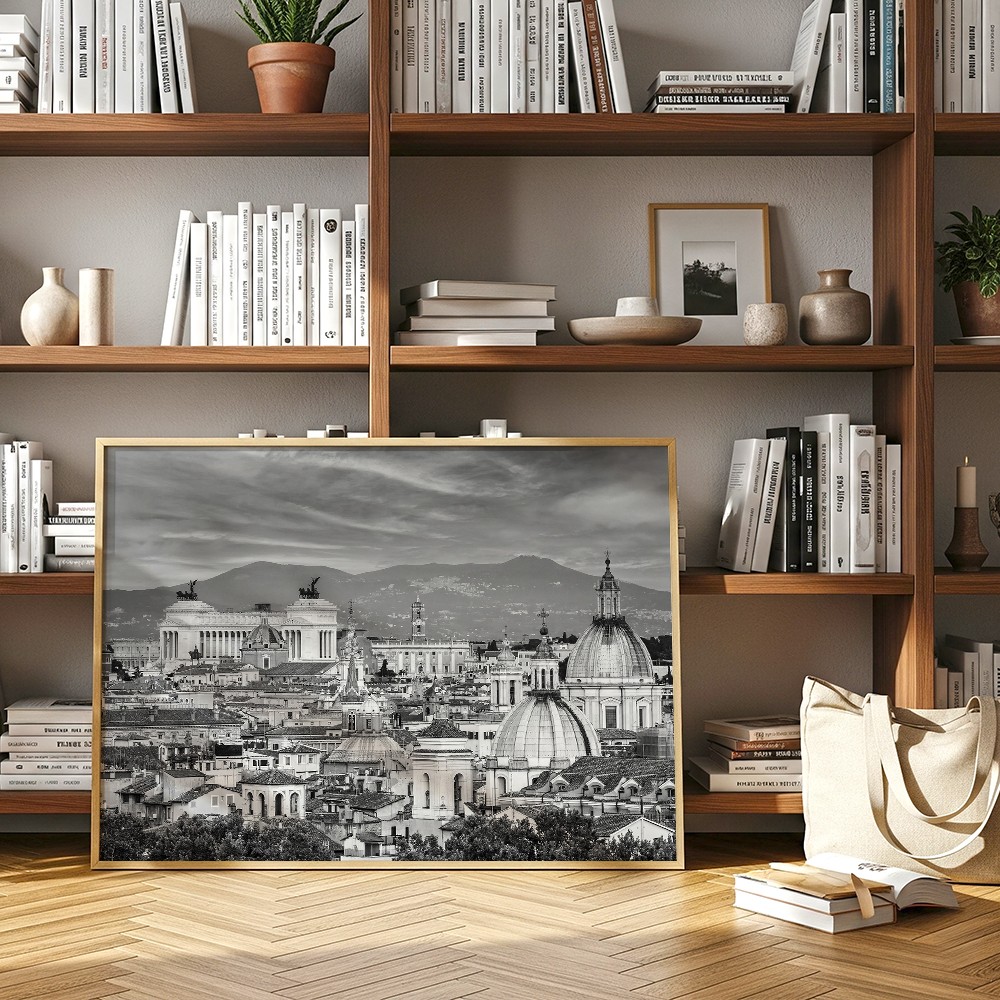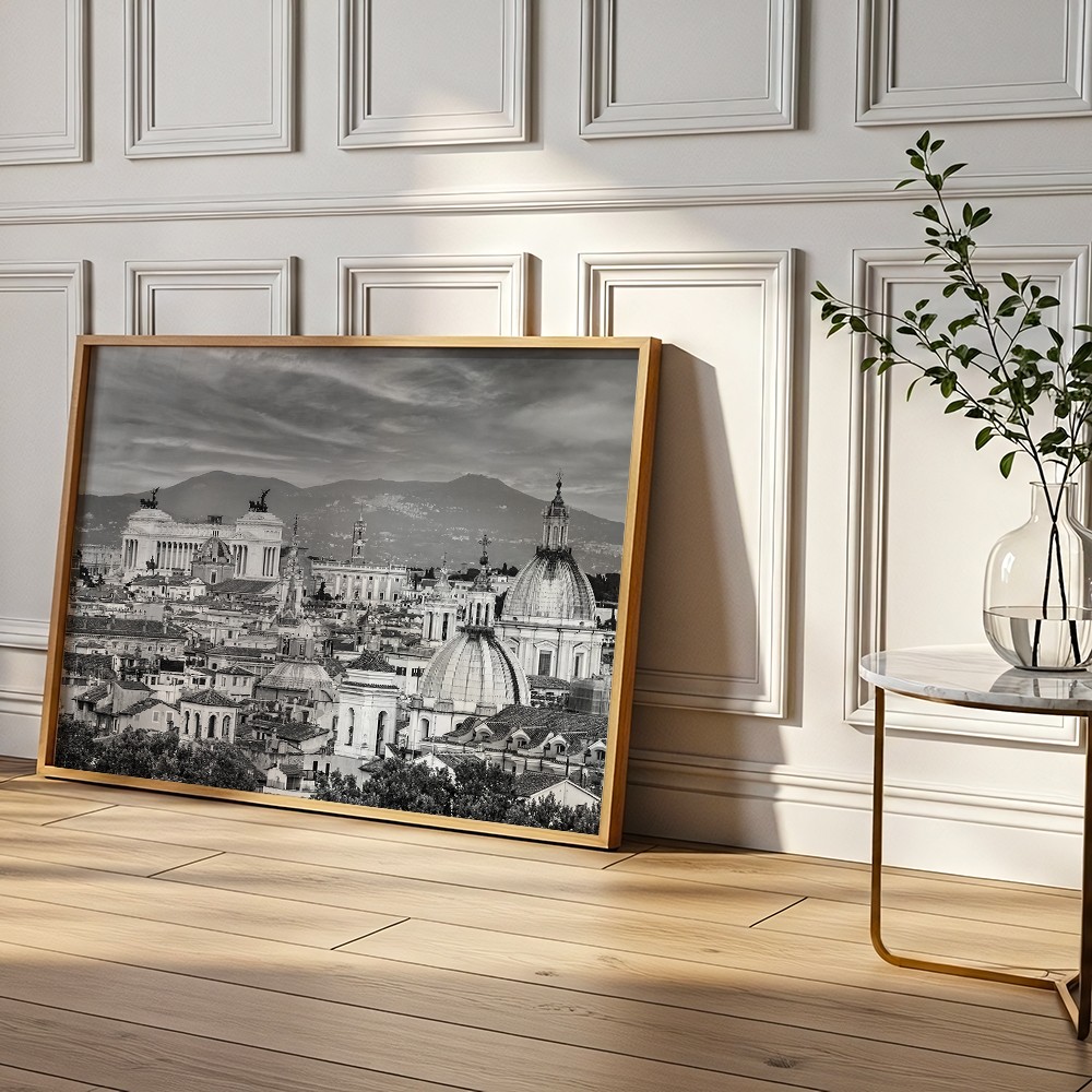 Fotograficzny plakat z panoramą Rzymu będzie stylowym akcentem w salonie, sypialni, gabinecie lub przedpokoju. Wprowadza do wnętrza atmosferę włoskiego miasta, subtelny rytm architektury i ponadczasowe odniesienie do podróży, historii oraz miejskiej estetyki.