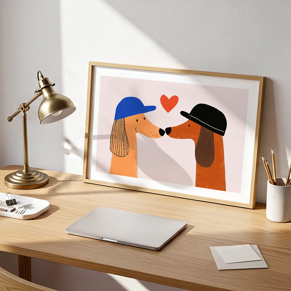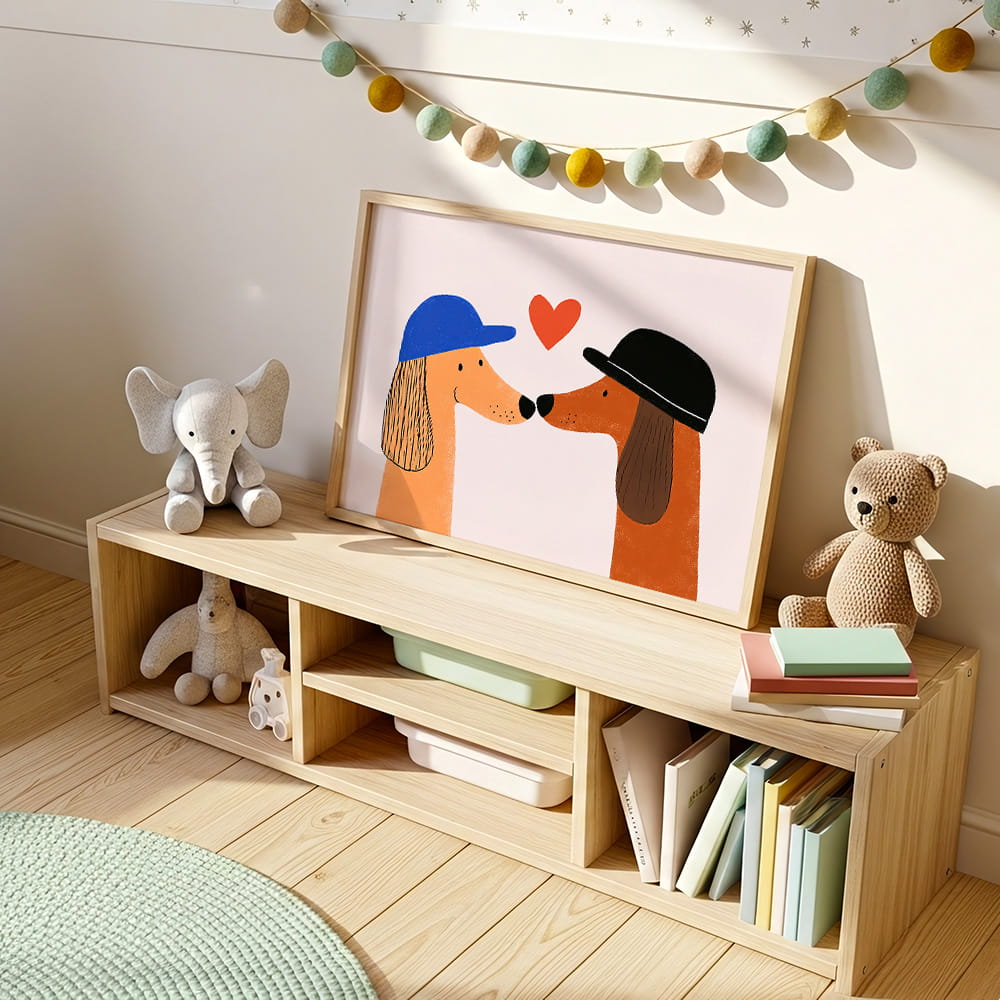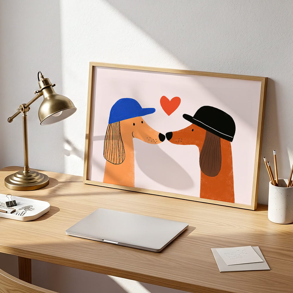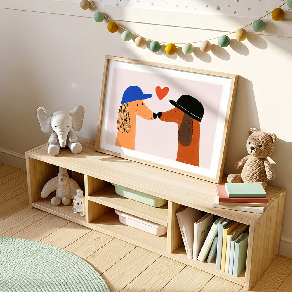 Plakat Zakochane pieski to dekoracja ścienna, która wnosi do wnętrza ciepło, radość i przyjazny, dziecięcy klimat. Urocza ilustracja dwóch piesków przyciąga uwagę prostą formą i subtelnym humorem, tworząc w pokoju dziecka pogodną oraz pełną uroku atmosferę.