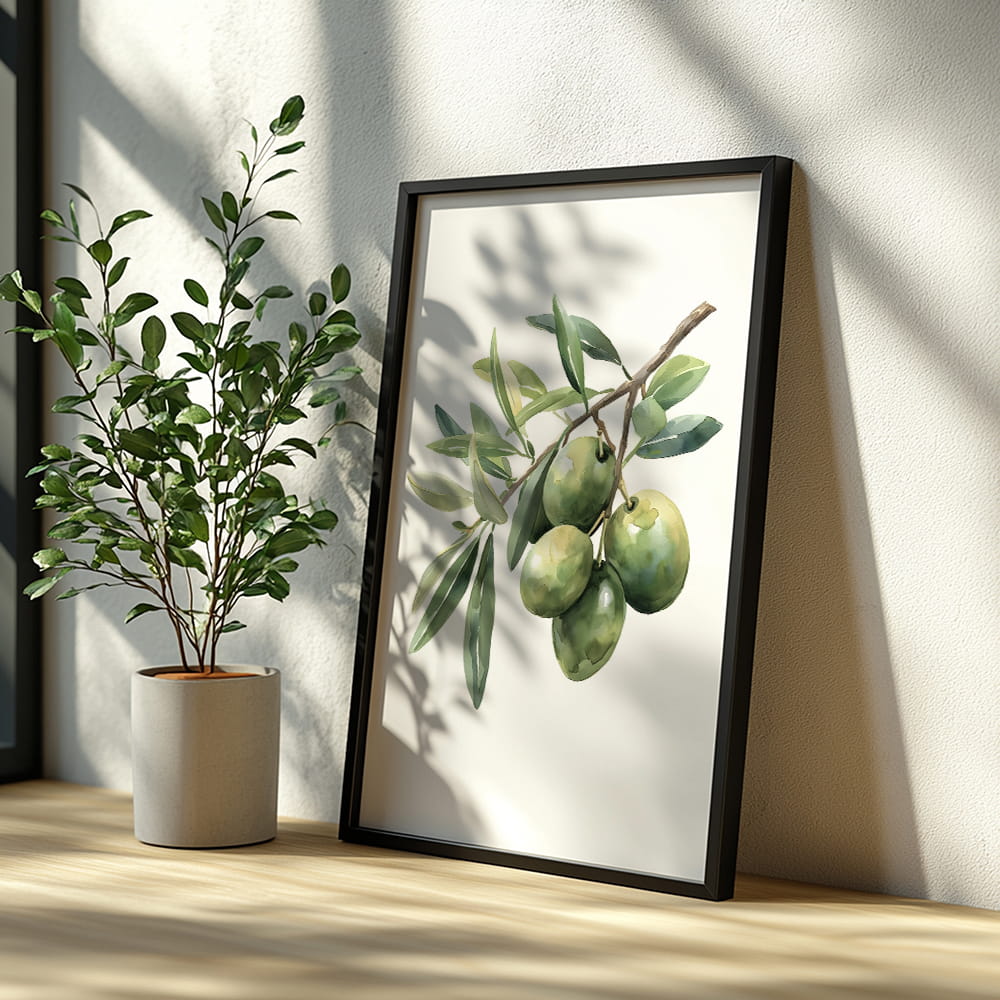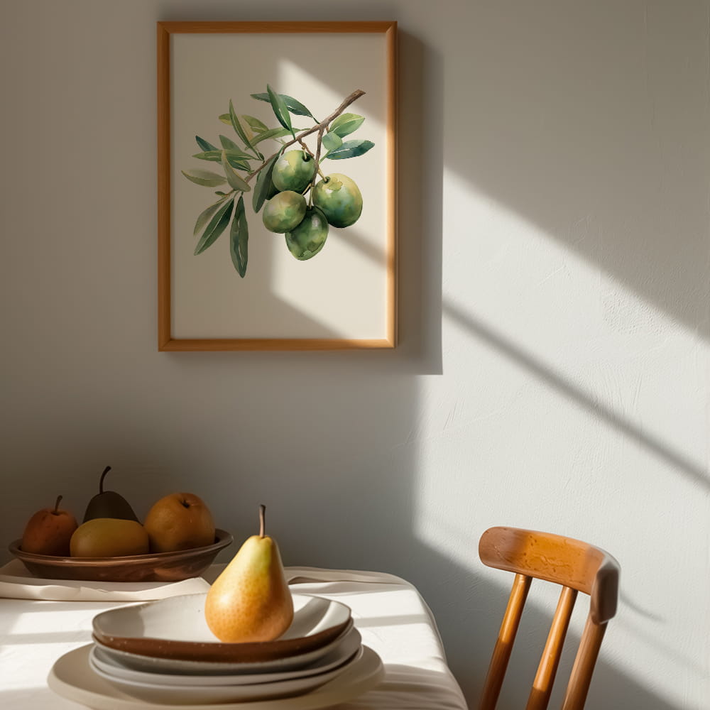 Plakat Zielone oliwki będzie idealnym wyborem dla osób, które lubią botaniczne motywy, naturalne dodatki i dekoracje ścienne nawiązujące do włoskiej oraz śródziemnomorskiej estetyki. To także ciekawy pomysł na prezent do stylowej kuchni lub jadalni.